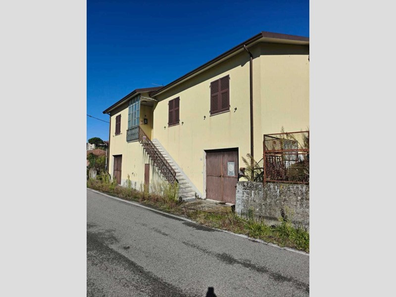Offers for sale in Villa di Panicale, in the municipality of Licciana Nardi, a detached house with an exclusive private courtyard, garden, double garage with two driveways, and a cellar. The first floor, accessed via an external staircase, comprises an entrance hallway, living room, kitchen, three bedrooms, and a bathroom with tub.