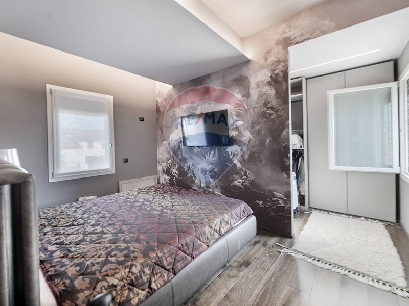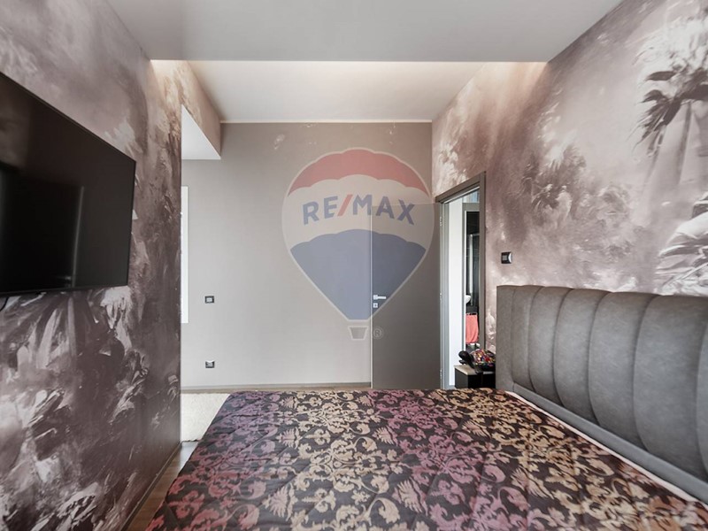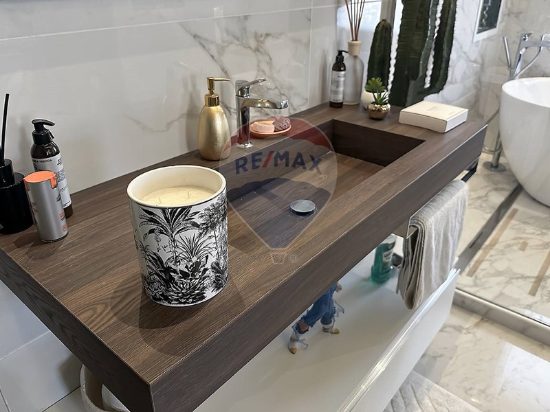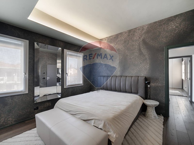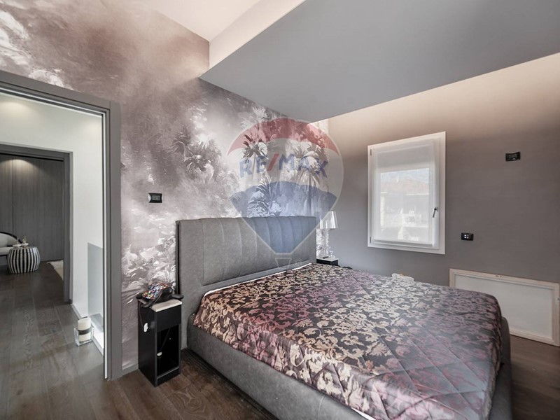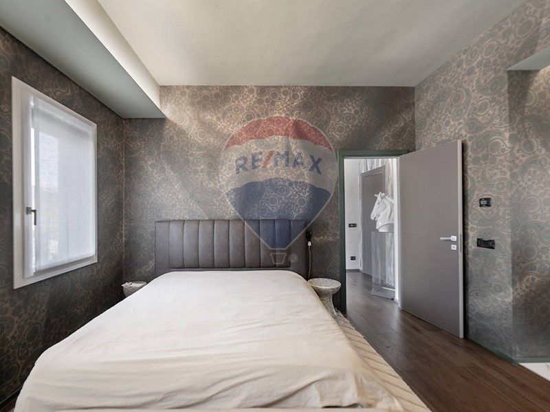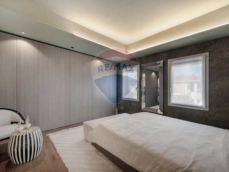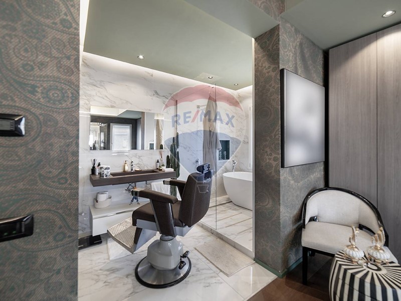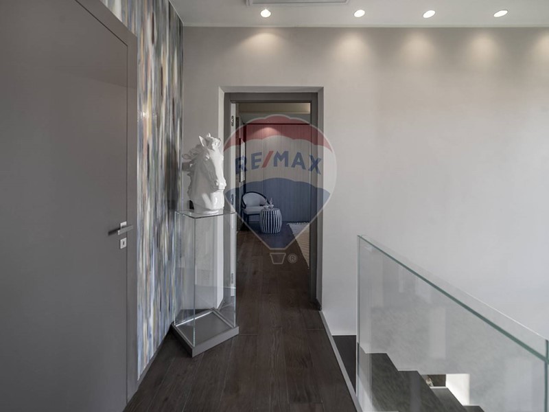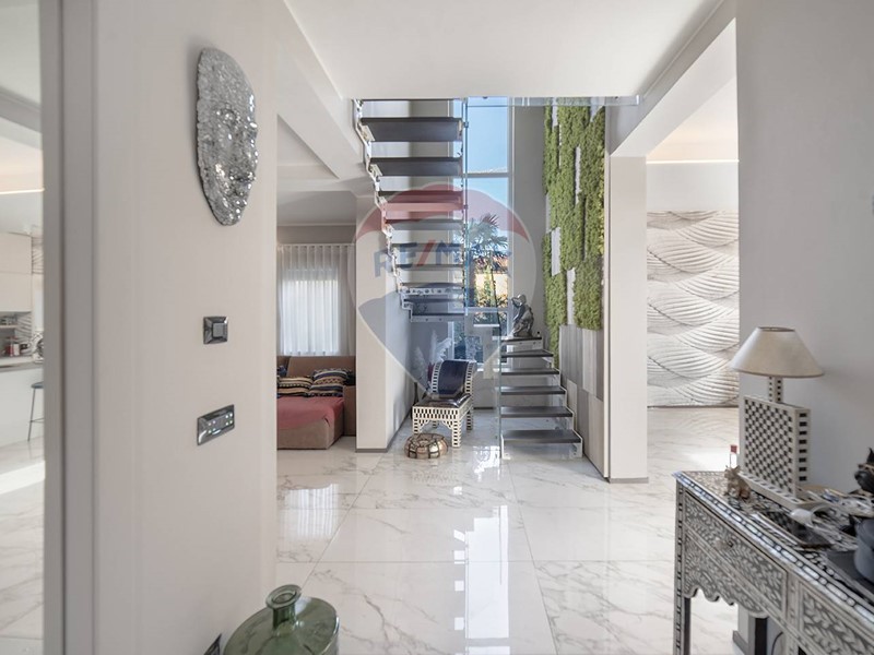 Una scala dal design contemporaneo, adagiata su una suggestiva parete di muschio naturale, conduce al piano superiore, dove si trovano due camere da letto, di cui una con cabina armadio, e due bagni. Una delle camere beneficia inoltre di balcone privato con vista sul giardino.