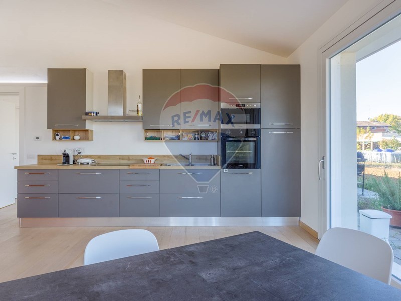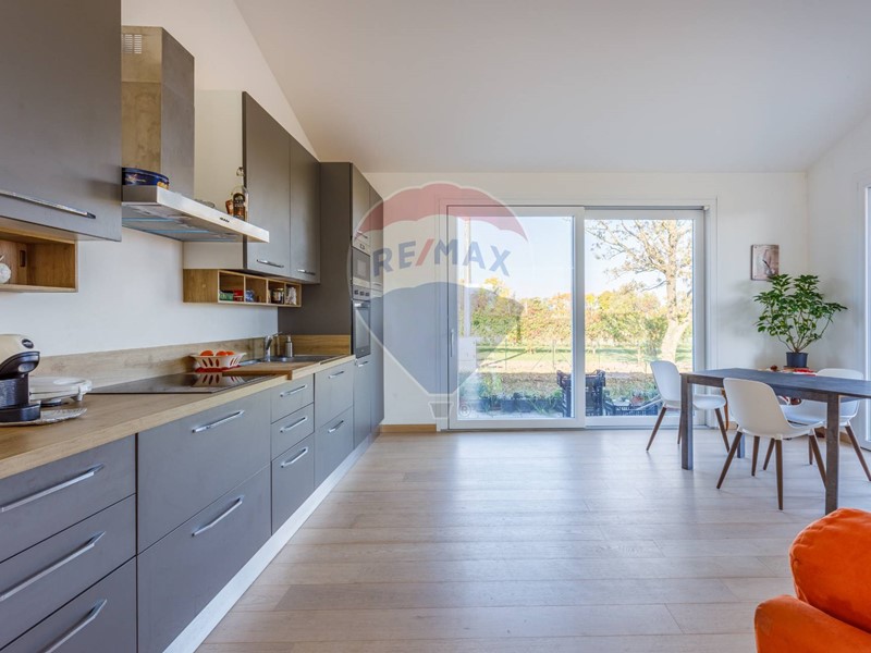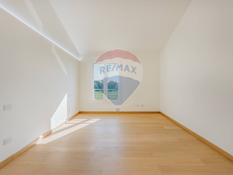 La zona giorno è un grande spazio di luce e proporzioni perfette: ampie vetrate si aprono sul giardino privato di circa 980 m², creando continuità tra interno ed esterno, tra bellezza e natura. La cucina, ampia e abitabile, è il cuore conviviale della casa: qui il tempo rallenta, i gesti diventano rituali, ogni momento ha un suo ritmo.