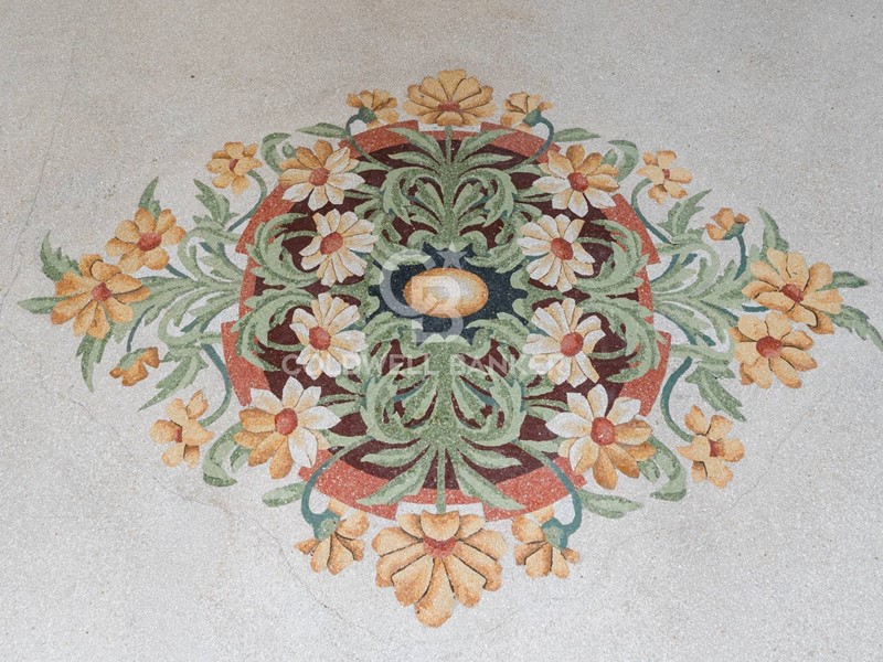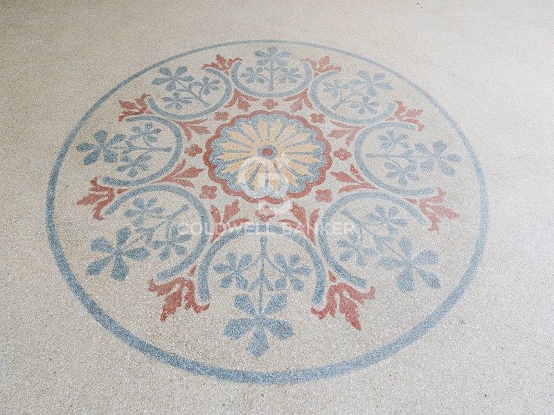Superata la soglia della villa, dopo aver percorso la gradinata, interamente in pietra leccese, e il ballatoio, si apre all vista una bellissima sala di rappresentanza affrescata, con pavimento in graniglia e un meraviglioso decoro floreale al centro. Attigue, sui due lati, altre due ampie sale con affaccio sul ballatoio, anch'esse con pavimenti in graniglia originali e volte a stella alte più di 5 metri.