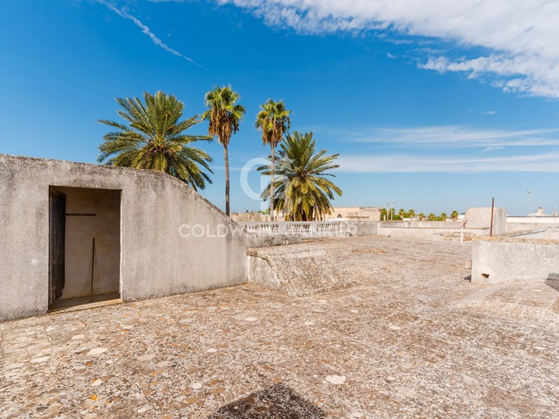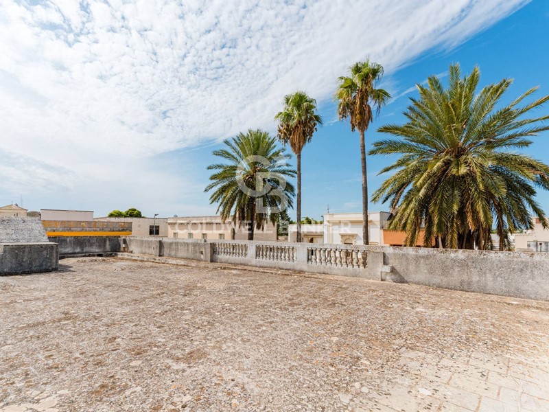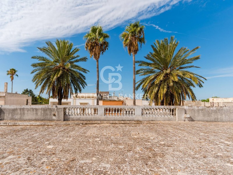 Percorrendo uno dei due corridoi, si trova la spaziosa scala in pietra leccese, che porta alla grande terrazza, sovrastata dalla maestosità e dall'eleganza delle palme secolari, che affaccia sul giardino anteriore e su tutta Sogliano Cavour, ariosa come se ne trovano solo nelle residenze d'epoca.