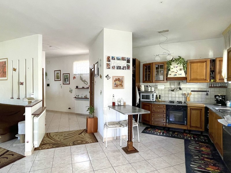 Lingresso conduce a un ampio salone con angolo cottura e zona relax con caminetto, dove la famiglia può ritrovarsi e godersi momenti di convivialità. Dal soggiorno si accede anche al primo balcone.