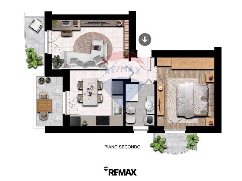 Labitazione, di circa 50 mq interni, accoglie un ambiente luminoso e curato nei dettagli: lingresso conduce alla zona giorno openspace con cucina a vista e accesso a due terrazzi con bella vista rilassante sui prati che circondano la casa, ideali anche per momenti di relax allaperto; la camera matrimoniale, riservata e accogliente, dispone di balcone privato, mentre il bagno finestrato è completo di sanitari sospesi e termo-arredo.