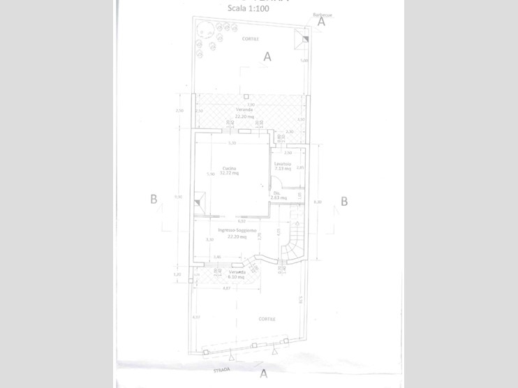 - Al piano terra troviamo ampio ingresso soggiorno di 22 mq, cucina abitabile con camino a legna di 32 mq, disimpegno, bagno con zona lavanderia, veranda di 22 mq e cortile di 65 mq;