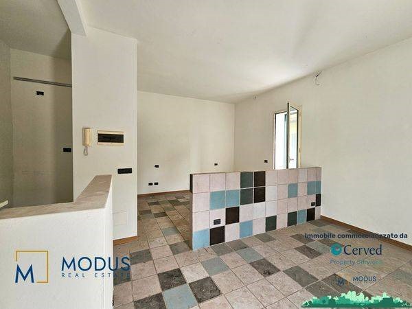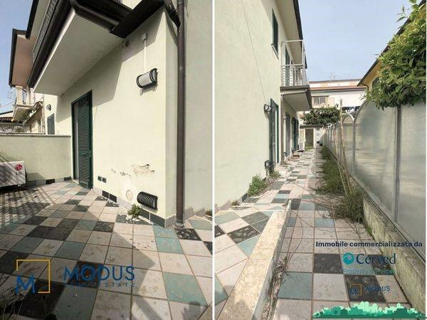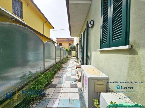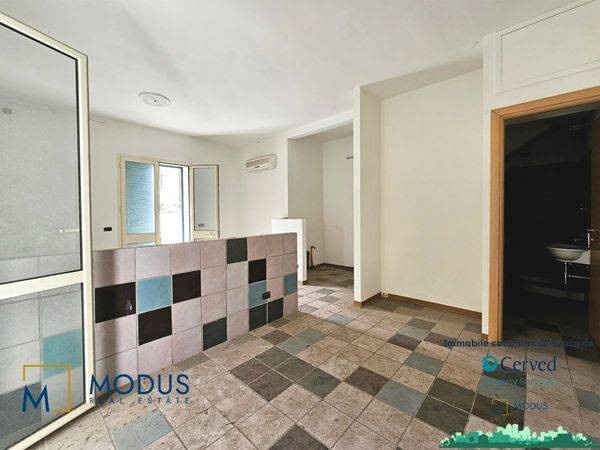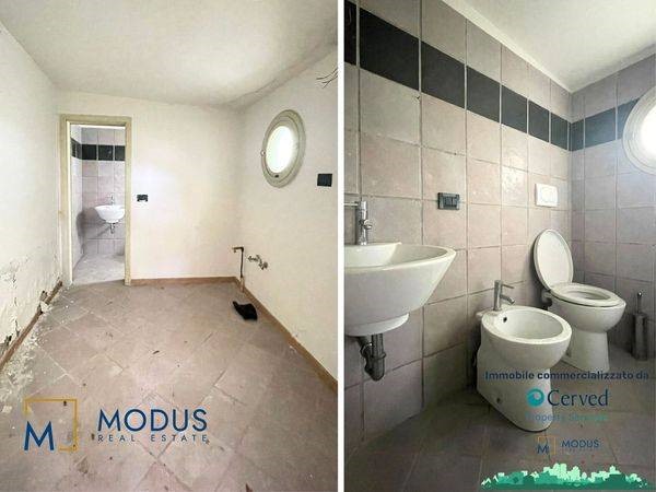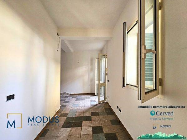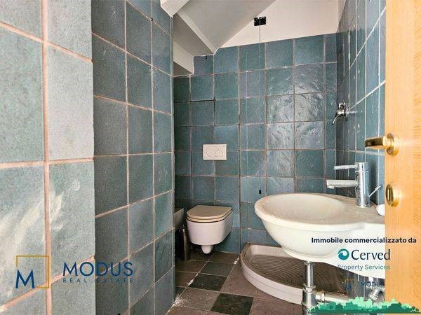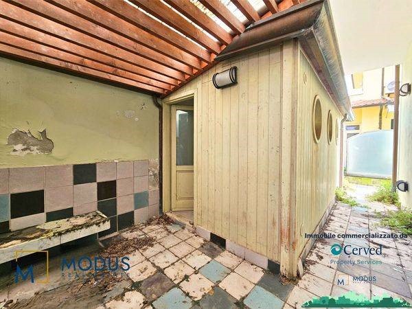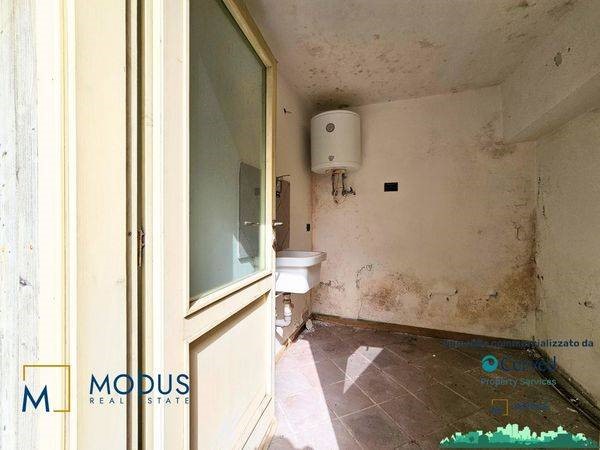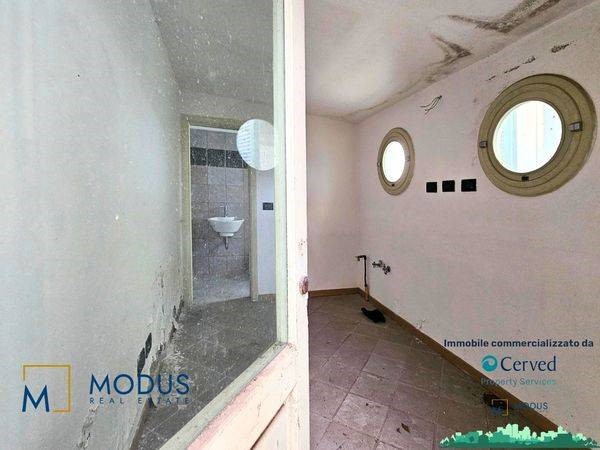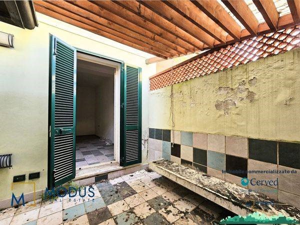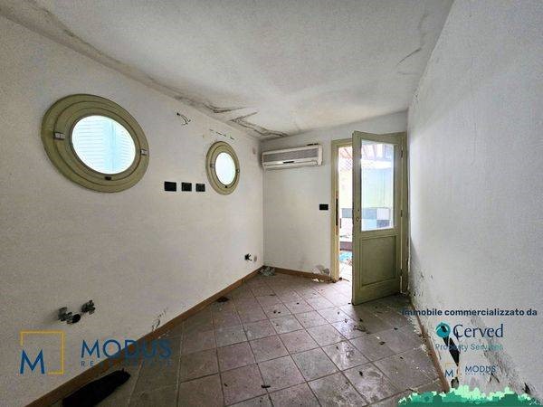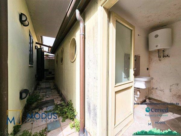 - Alla prima unità si accede dal resede, di circa 14 mq, ad una porta di accesso che immette subito in un ampio locale, dove è presente un piccolo muretto basso posto trasversalmente al vano. Nella parte retrostante della stanza è presente un piccolo bagno che si sviluppa parzialmente in un sottoscala, dove vi è uno scaldabagno. Superficie totale di circa 36 mq