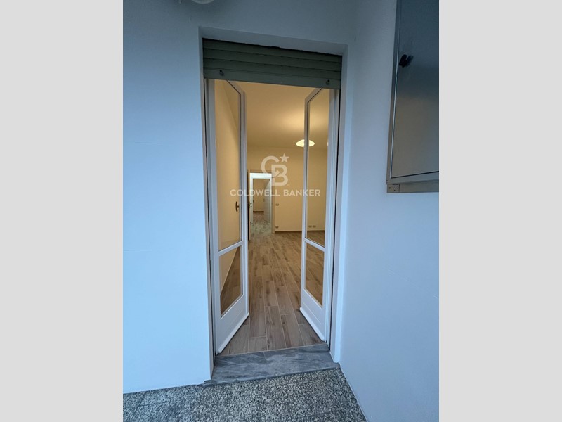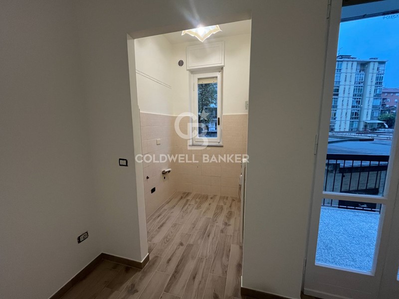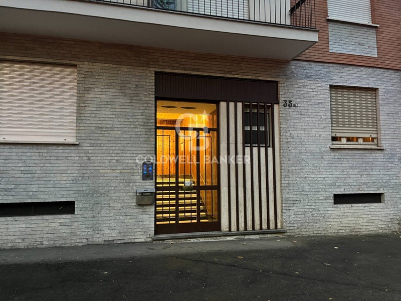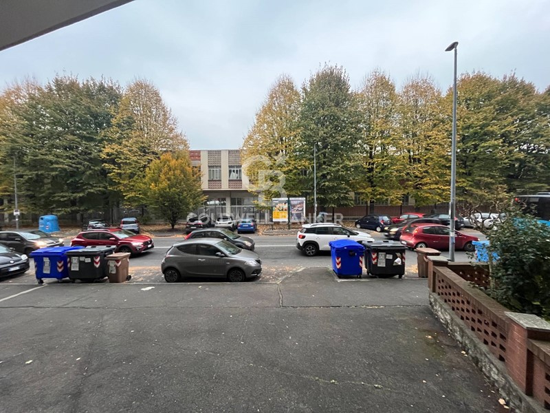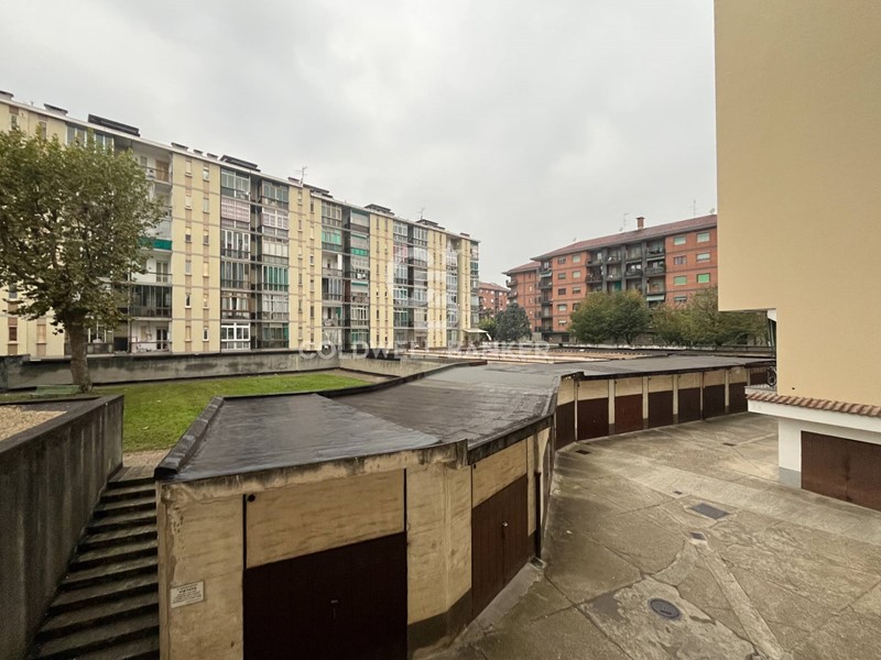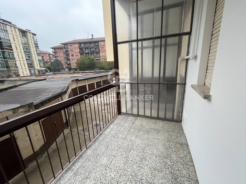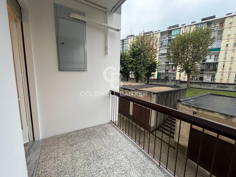 L'appartamento ha la camera da letto che affaccia lato C.so Roma mentre il tinello affaccia su un ampio balcone lato cortile da cui si vede il giardino condominiale.