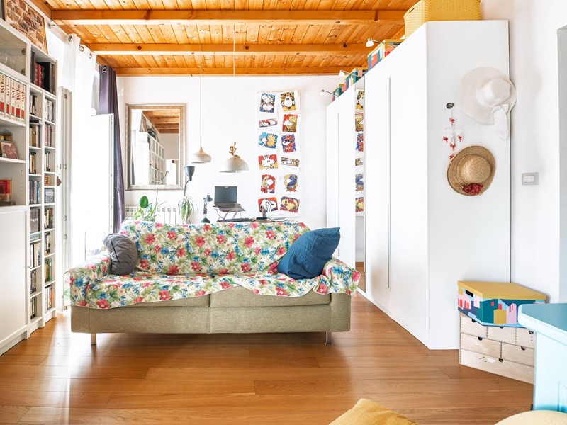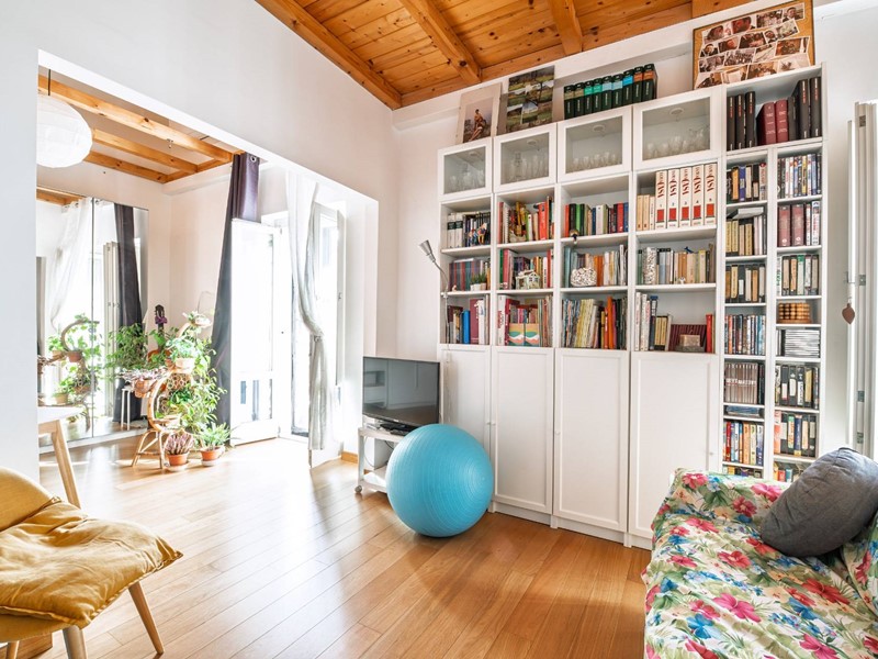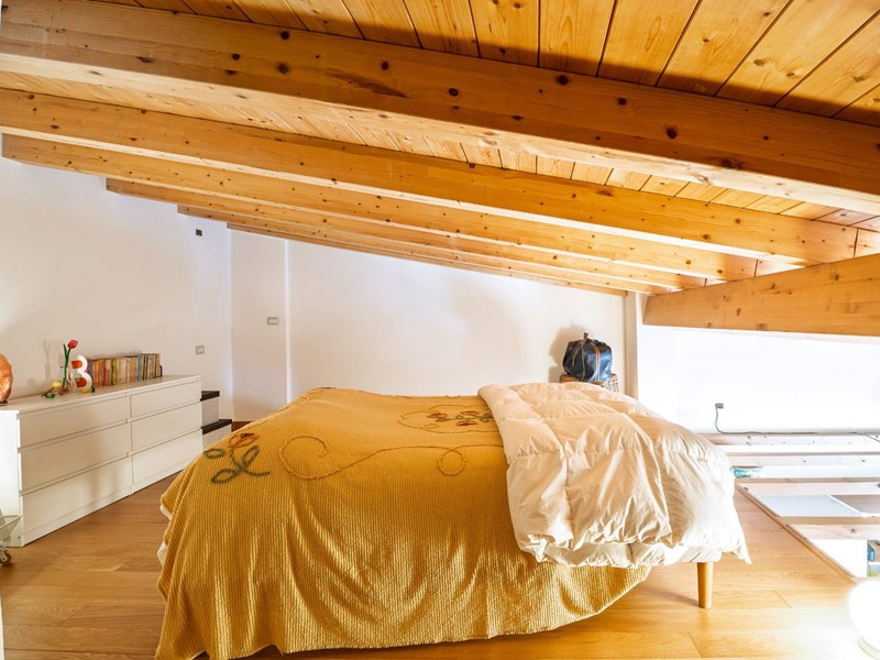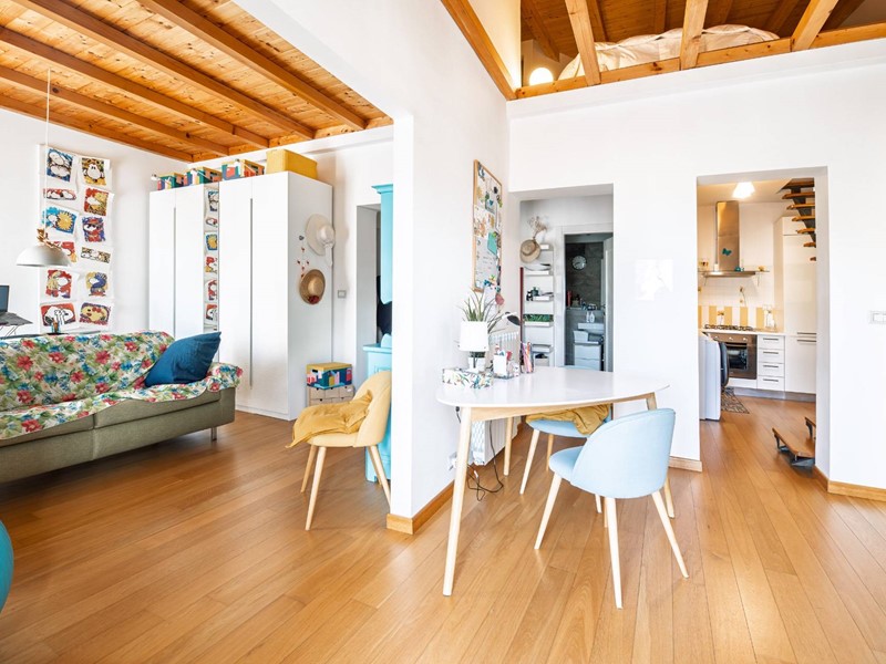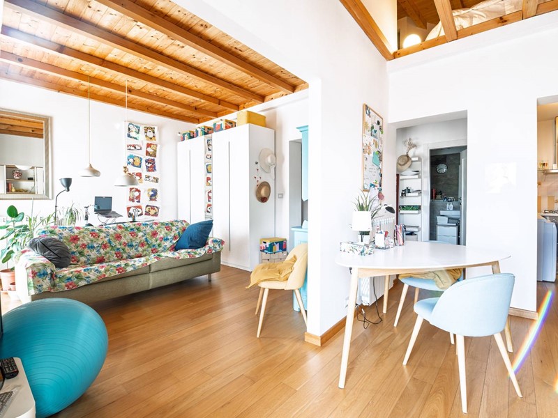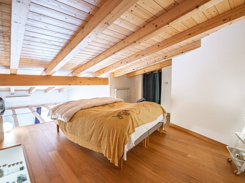 Le finiture interne sono di altissimo livello, creando un'atmosfera calda e di pregio. Si evidenziano in particolare la raffinata pavimentazione in parquet in tutti gli ambienti e le caratteristiche travi in legno a vista che aggiungono un tocco di charme unico. Per il comfort e la sicurezza esterna, il balcone è dotato di tende da sole e l'immobile dispone di grate in ferro.