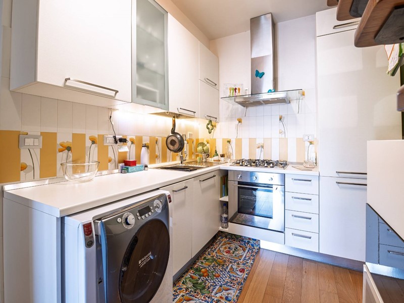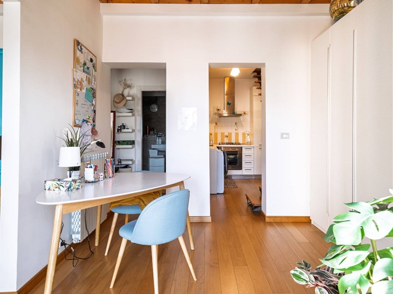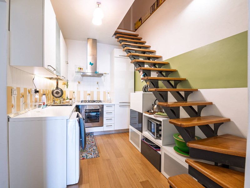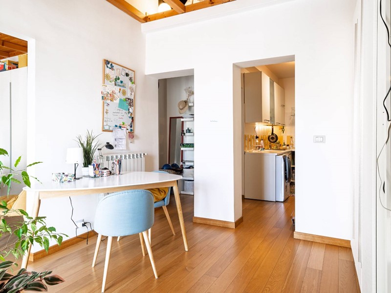 La casa si compone di un soggiorno con accesso diretto al balcone, una cucina a vista, una camera da letto e un bagno, al piano superiore un'altra stanza con bagno di servizio e ripostiglio.