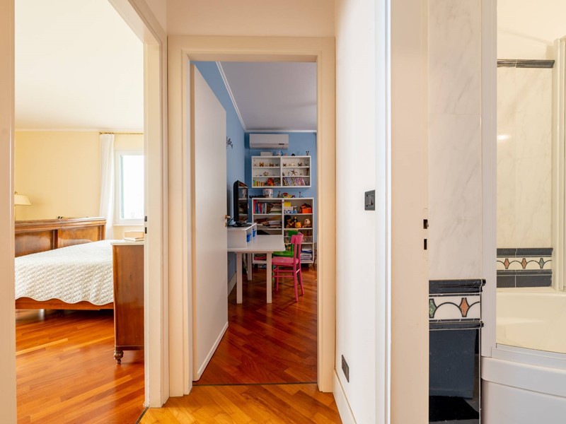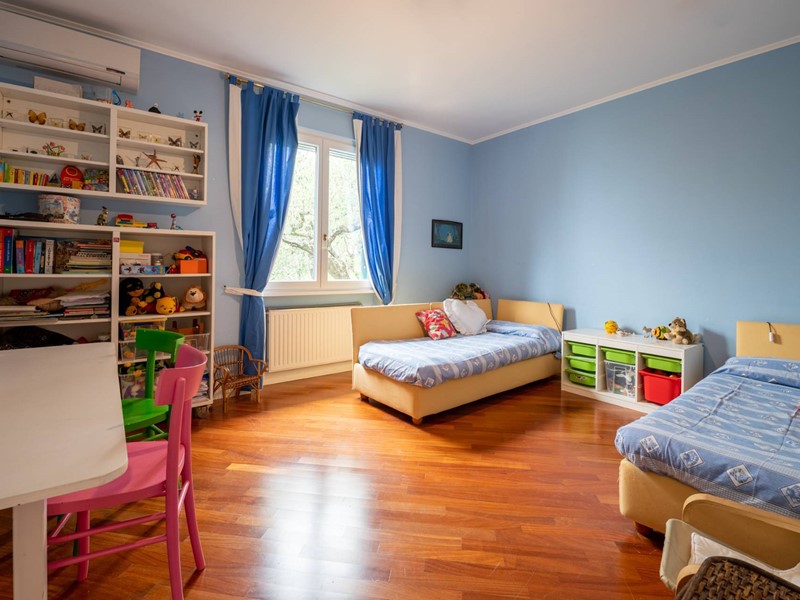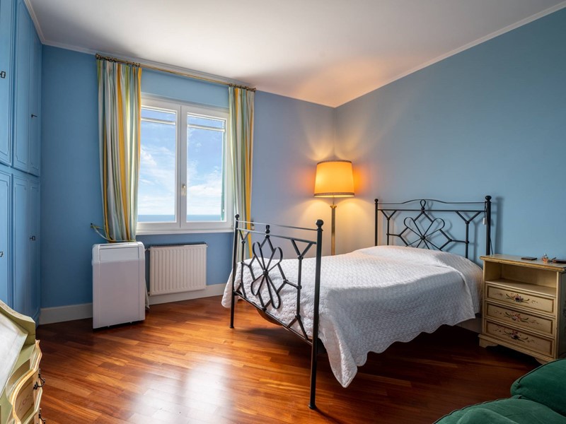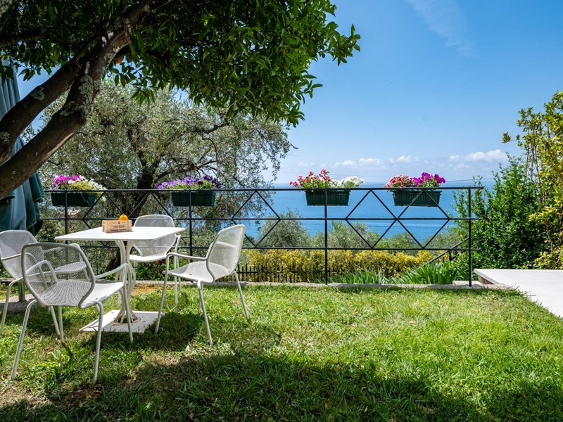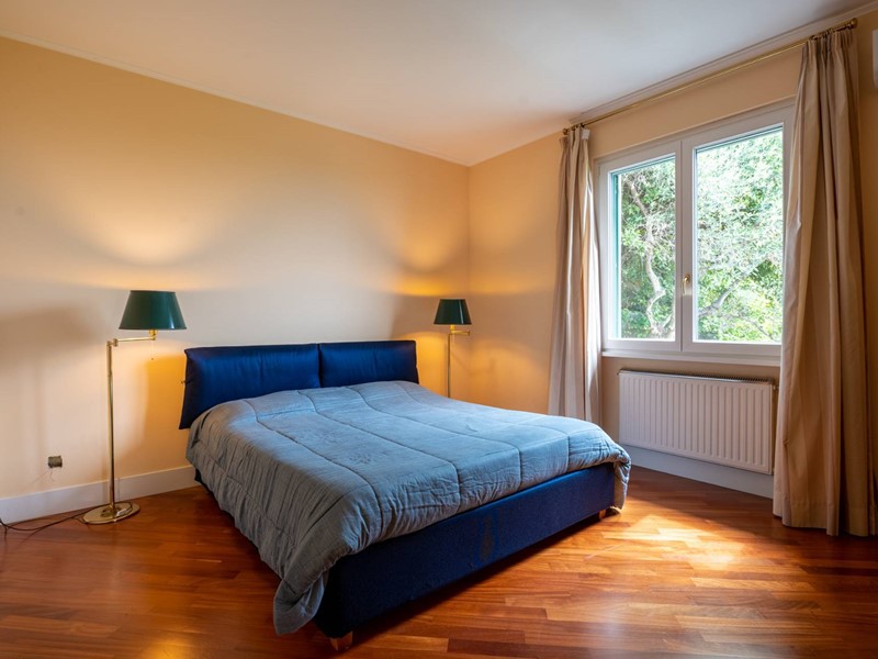 Unelegante scala conduce al piano superiore, dove si aprono cinque spaziose camere matrimoniali, tutte climatizzate e dotate di grandi finestre che regalano luce naturale e incantevoli vedute sul mare e sul verde circostante. Completano il piano tre bagni, tutti finestrati. Da qui si accede direttamente al meraviglioso giardino di circa 1.900 mq, suddiviso su più fasce e arricchito da 140 ulivi, piante ornamentali e alberi da frutto. Il giardino, in gran parte servito da impianto di irrigazione automatica, offre diverse aree relax, un forno a legna con barbecue, un patio e un ampio terrazzo panoramico ideale per momenti conviviali allaperto.