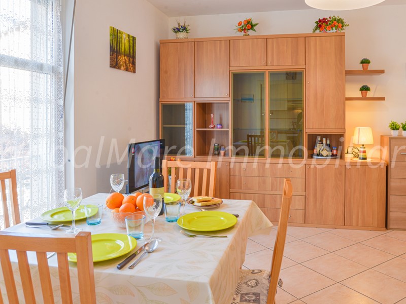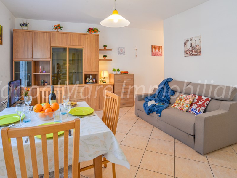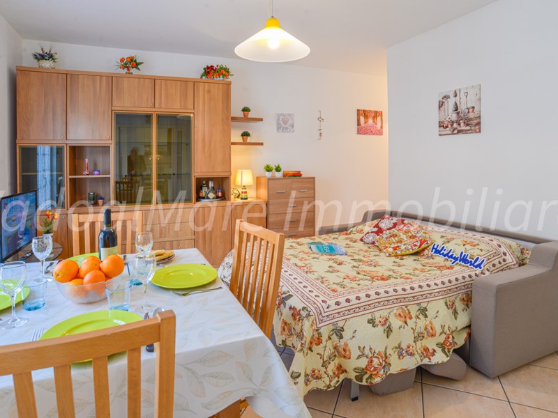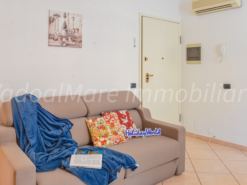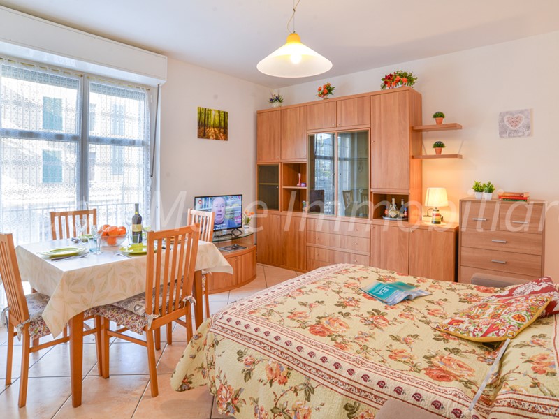 L’ingresso si apre su un ampio soggiorno arredato con gusto, dove trova spazio un comodo divano letto. Il cucinino, separato da una elegante porta scorrevole in vetro, è funzionale e ben attrezzato. Un balcone alla francese garantisce luce naturale e ariosità alla zona giorno.