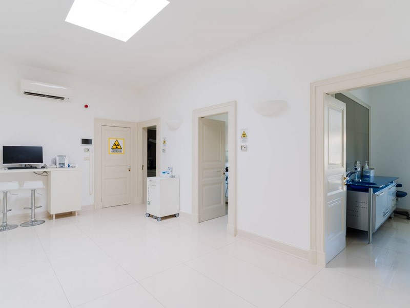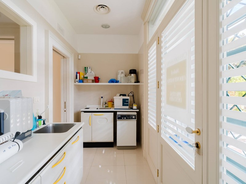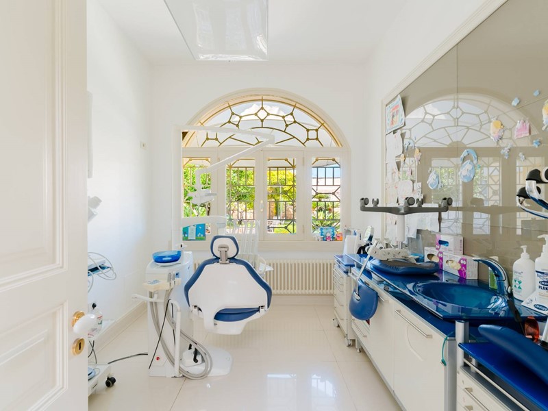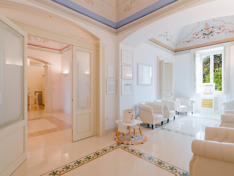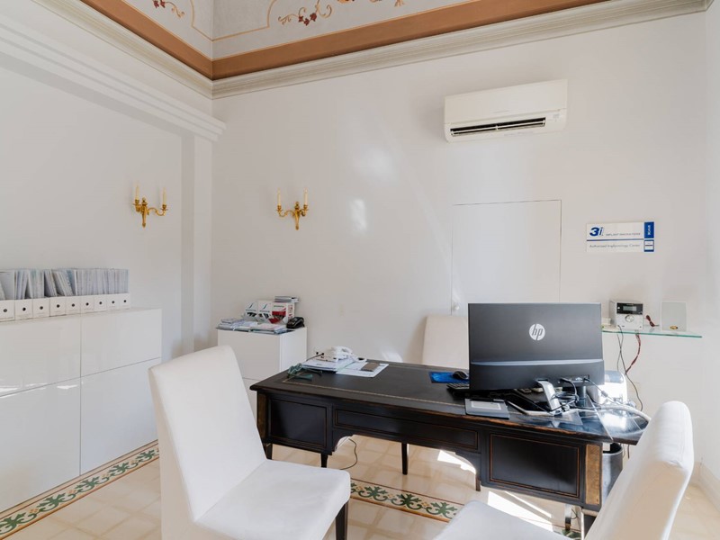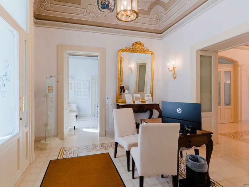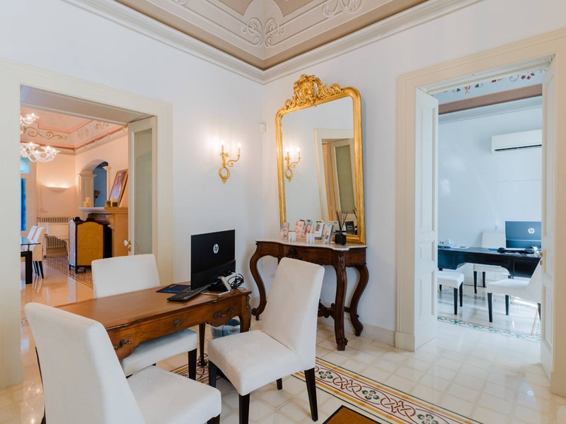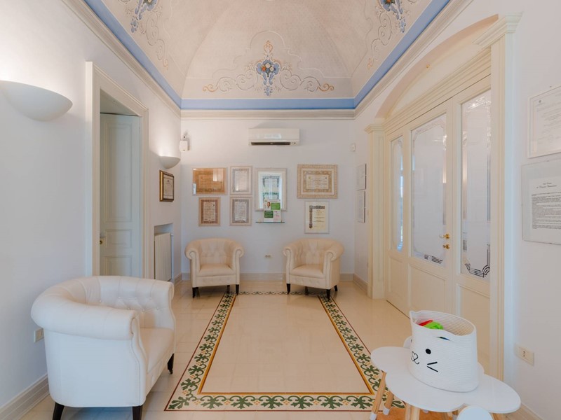 Il piano nobile (terra) è suddiviso in due parti ben distinte, una dedicata all'attività svolta dai proprietari e cioè rinomata clinica odontoiatrica composto da accettazione, sala d'attesa, tre sale operatorie, sala radiografica, oltre servizi specifici e dedicati. La parte speculare opposta è totalmente residenziale. Abbiamo un ampio e luminosissimo salone con caminetto in pietra, una comoda sala da pranzo con cucina abitabile in muratura che ci conduce ad una veranda attrezzata oltre servizi ed infine uno studio ufficio. Pavimenti in pietra di Trani con mosaici, volte dipinte, porte in legno laccate bianche di pregio, caratterizzano questa ala della casa.