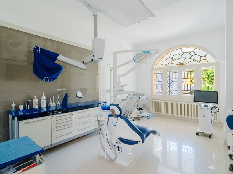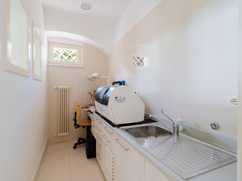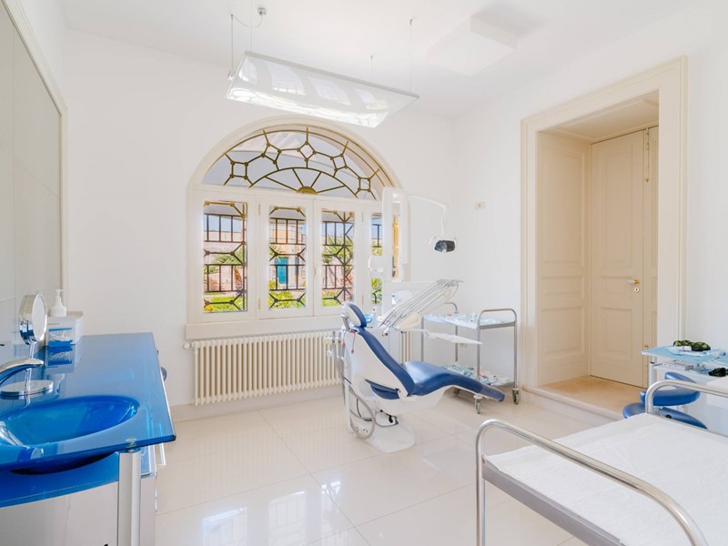 Il piano nobile (terra) è suddiviso in due parti ben distinte, una dedicata all'attività svolta dai proprietari e cioè rinomata clinica odontoiatrica composta da accettazione, sala d'attesa, tre sale operatorie, sala radiografica, oltre servizi specifici e dedicati. La parte speculare opposta è totalmente residenziale. Abbiamo un ampio e luminosissimo salone con caminetto in pietra, una comoda sala da pranzo con cucina abitabile, realizzata in muratura, che ci conduce ad una veranda attrezzata, ovviamente oltre servizi, ed infine uno studio ufficio. Pavimenti in pietra di Trani con mosaici, volte dipinte, porte in legno laccate bianche di pregio, caratterizzano questa ala della casa.