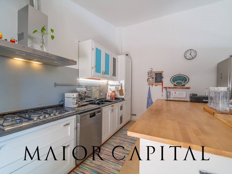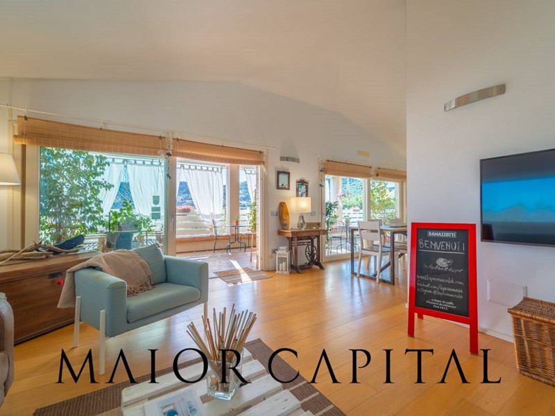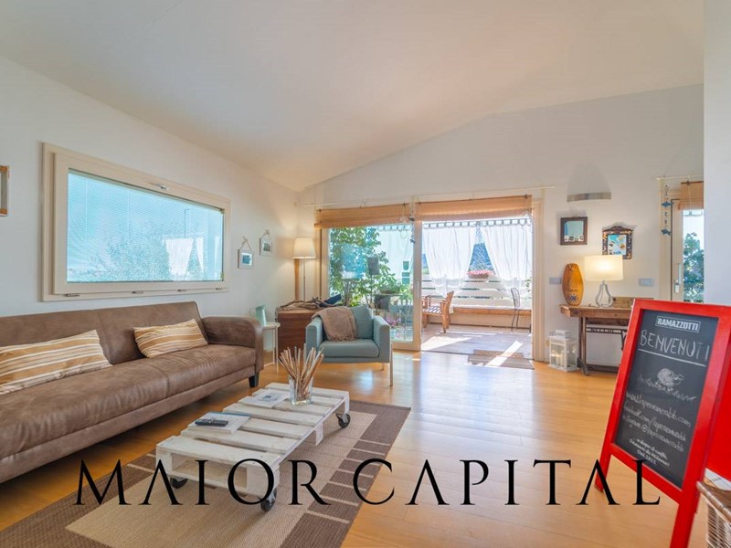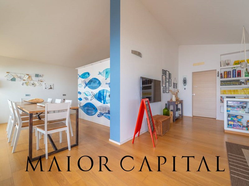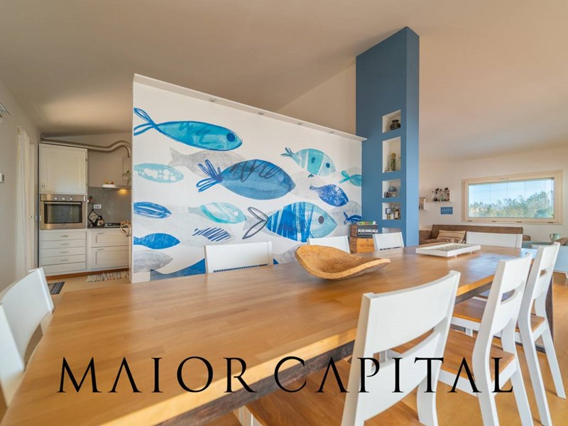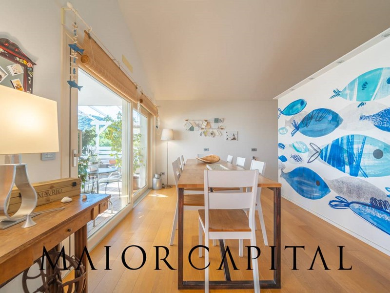 La proprietà si sviluppa su tre livelli: al piano terra rialzato, lingresso conduce a un ampio e luminoso soggiorno con cucina a isola, valorizzato da due grandi porte scorrevoli in vetro che permettono alla luce naturale di avvolgere delicatamente gli ambienti. A rendere latmosfera ancora più suggestiva, una veranda incorniciata da tende bianche, ideale per godere di albe e spettacolari tramonti estivi. Completano il piano una sala da pranzo separata, tre camere da letto e due bagni rifiniti con cura.