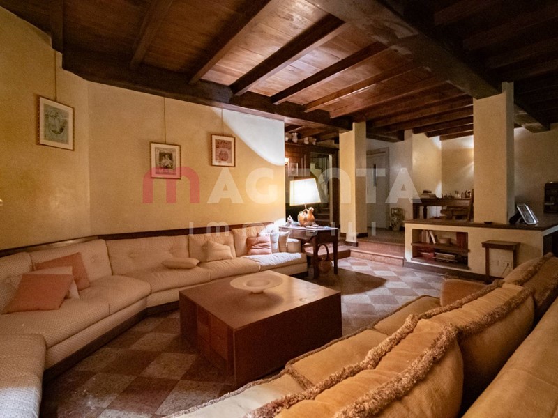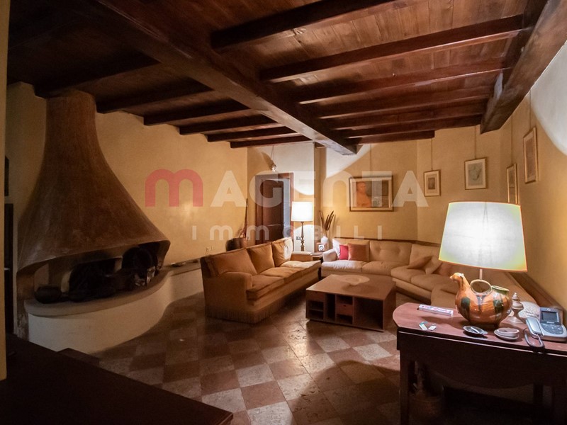 Al primo piano troviamo il grande appartamento attualmente così disposto: ingresso spazioso con ripostiglio appendiabiti, ampio salone con camino in pietra, sala da pranzo con boiserie in essenza pregiata, entrambi con uscita su un ampio e panoramico terrazzo. La cucina è spaziosa e abitabile, con adiacenti una stanza, un bagno ed un ripostiglio lavanderia. La zona può essere adibita a studio, terza camera o locali di servizio.
