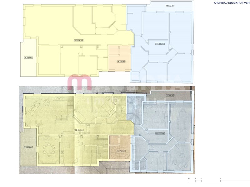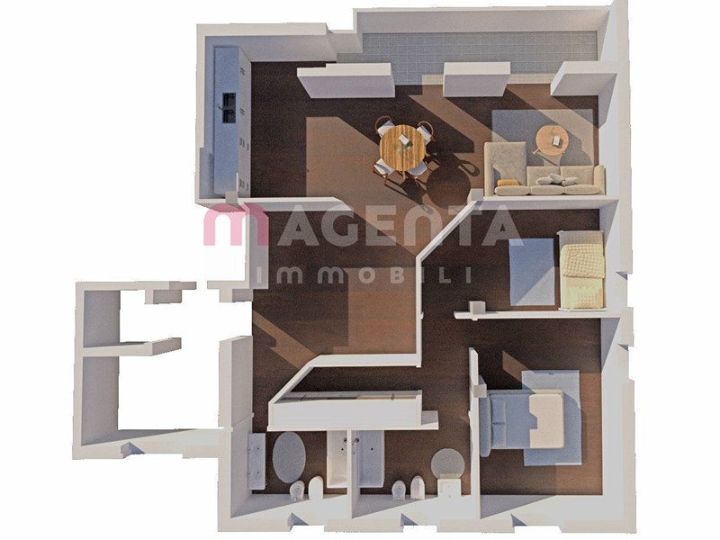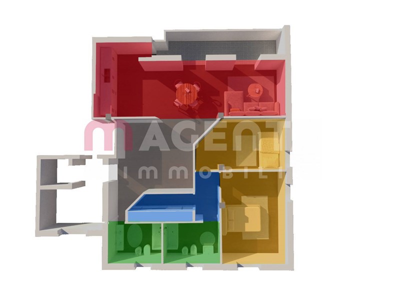 L'immobile si presta facilmente ad una personalizzazione e una conversione in abitativo. Siamo al primo piano, dotato di ascensore e la proposta prevede la possibilità di realizzare un grande appartamento così disposto: ingresso spazioso che distribuisce sulla sinistra la zona giorno con cucina a vista e ampio living, il tutto affacciato sul panoramico terrazzo. A destra dell'ingresso troviamo il bagno che serve la zona giorno. Un disimpegno notte conduce a due ampie camere e grande bagno a servizio delle camere.