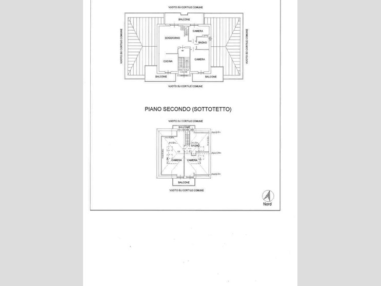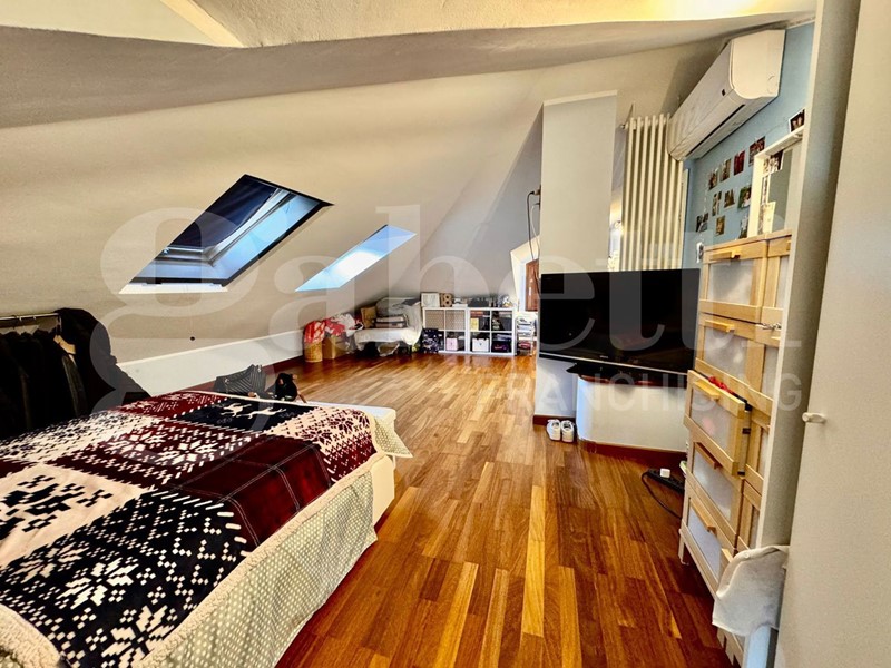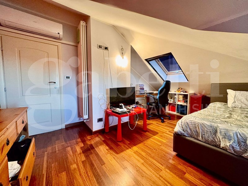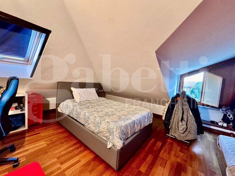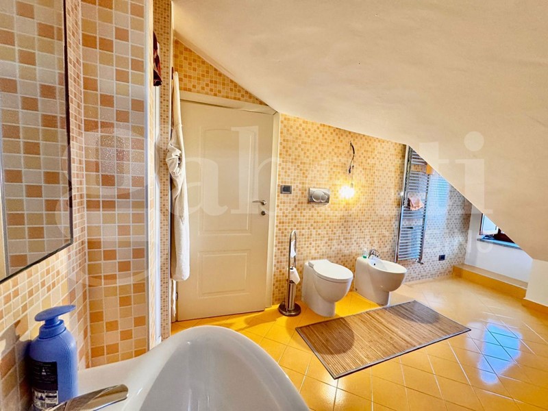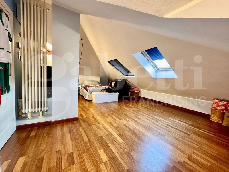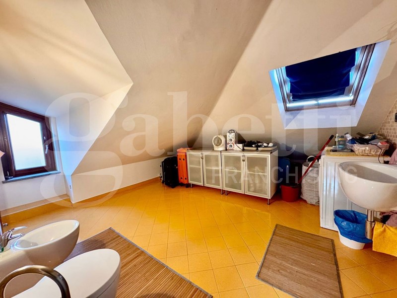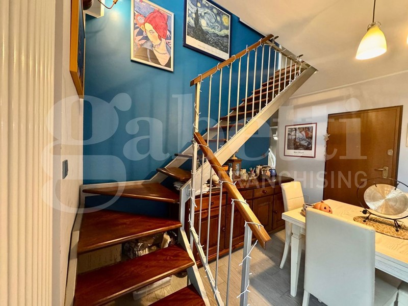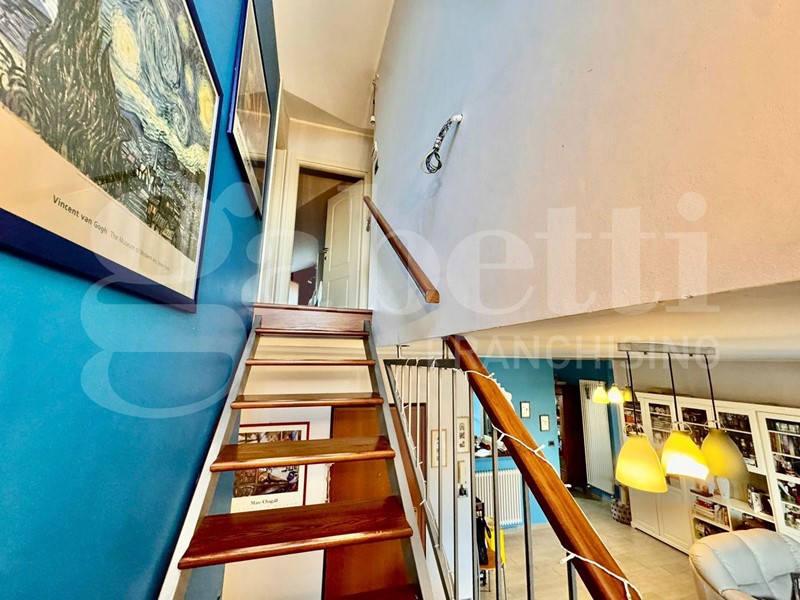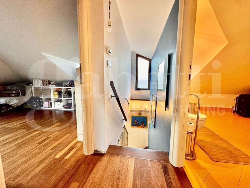 Una comoda scala in legno conduce al piano superiore dove troviamo una mansarda abitabile di disimpegno, due camere e servizio.