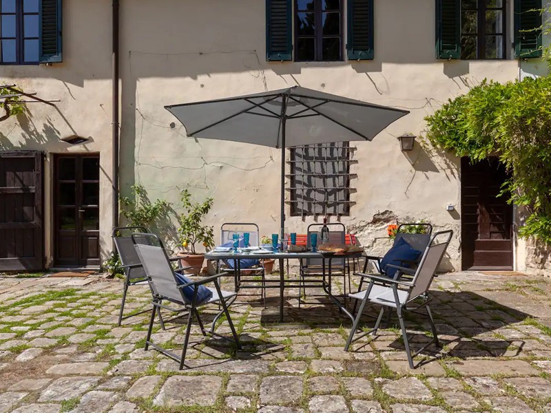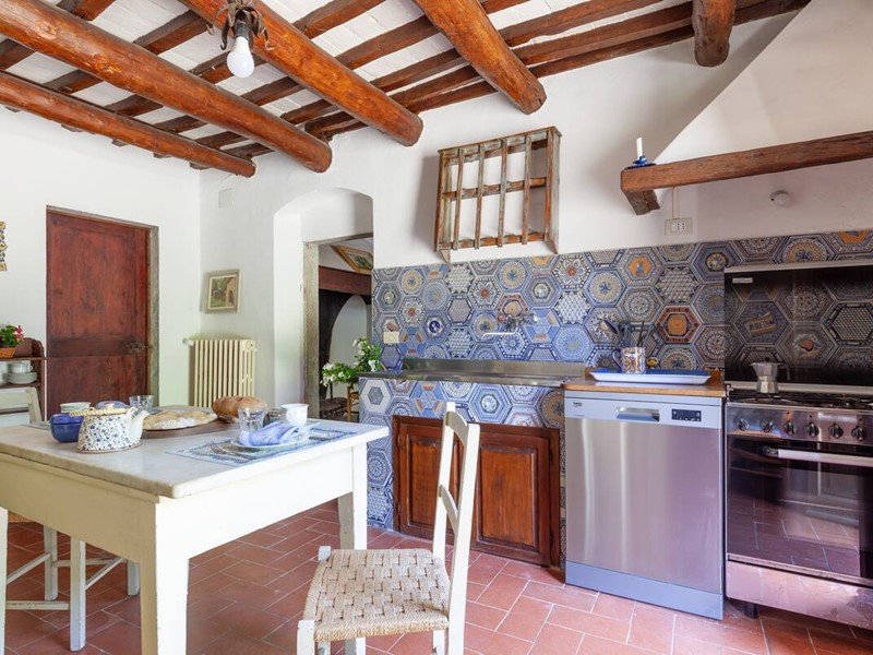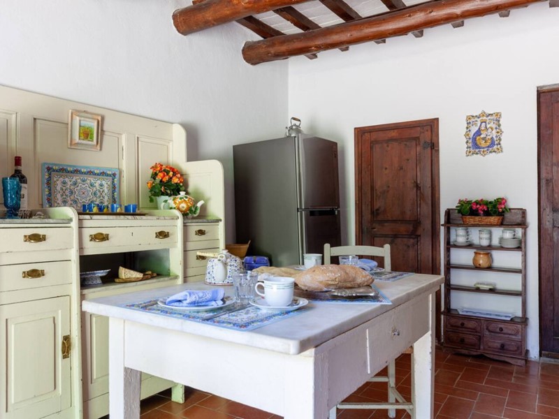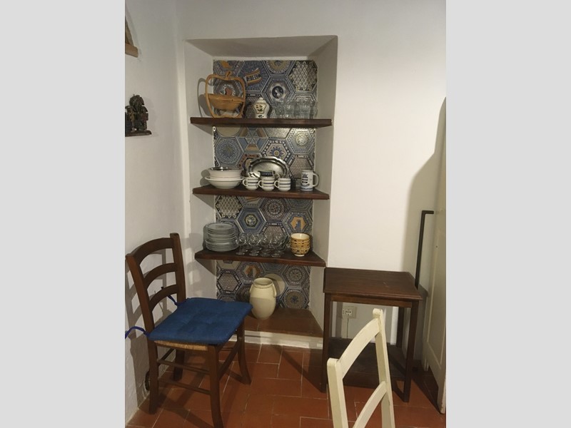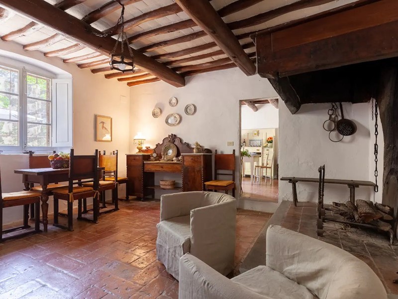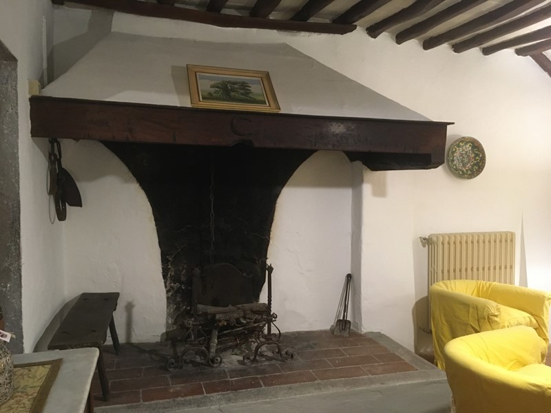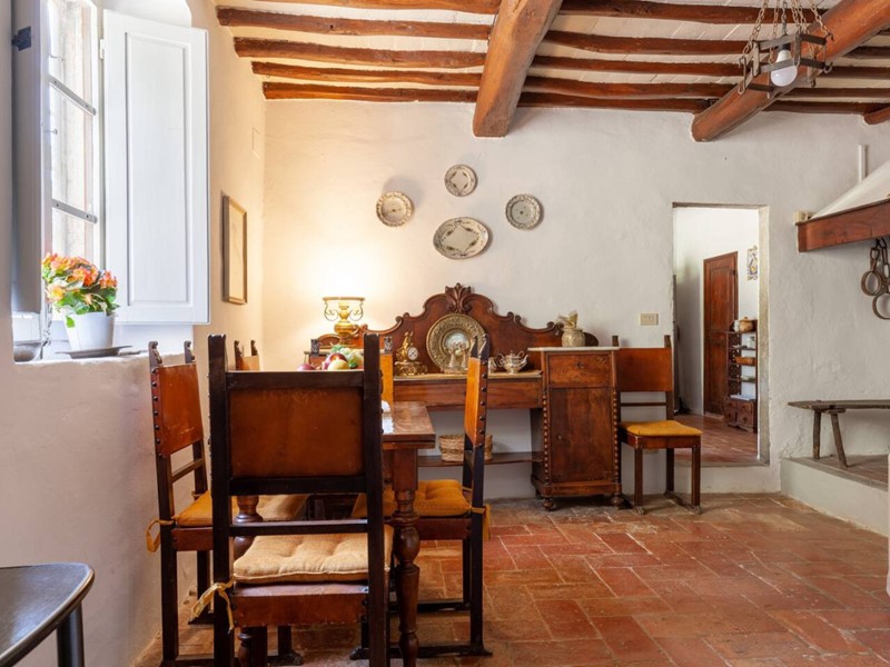 - Piano terra: ingresso, ampia sala con grande camino, zona pranzo, cucina in muratura affacciata sull’aia condivisa, bagno con doccia, stanza caldaia/lavatrice.