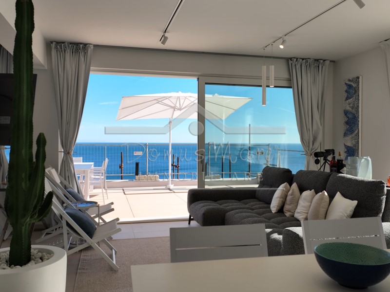 All’esterno, il terrazzo vista mare è un luogo magico, qui il tempo sembra rallentare, il profumo della salsedine si fonde con quello dei pini marittimi e lo sguardo si perde tra il blu del mare e l’azzurro del cielo.