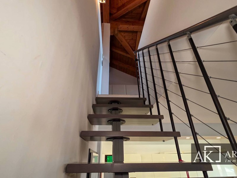 Il piano superiore, mansardato con soffitto in legno e travi a vista, ospita un grande open space versatile, un secondo bagno e un secondo terrazzo panoramico.