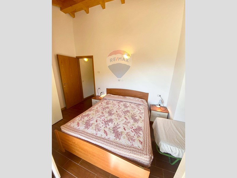 Salendo al piano superiore attraverso una scala interna, troverete un bagno completo di doccia e servizi, oltre a una spaziosa camera da letto che ospita un letto matrimoniale e uno singolo. Il soffitto alto offre la possibilità di soppalcare la camera, aggiungendo ulteriore spazio o creando un ambiente diversificato.