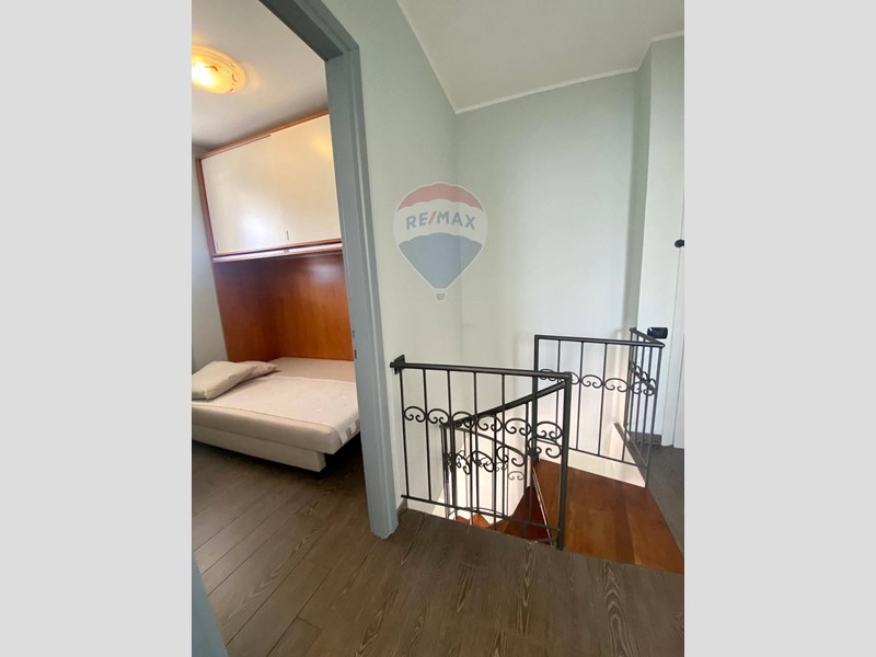 Con una superficie di 80 metri quadrati su due livelli, l'appartamento offre un'ampia area living con cucina a vista e camino che si affaccia sulla veranda coperta e sul giardino privato di circa 100 metri quadrati. Al piano superiore, un' anticamera con zona armadio conduce alla camera matrimoniale con vista sul terrazzo con affaccio sul lago e alla camera singola con vista lago. Il bagno è dotato di una grande doccia.