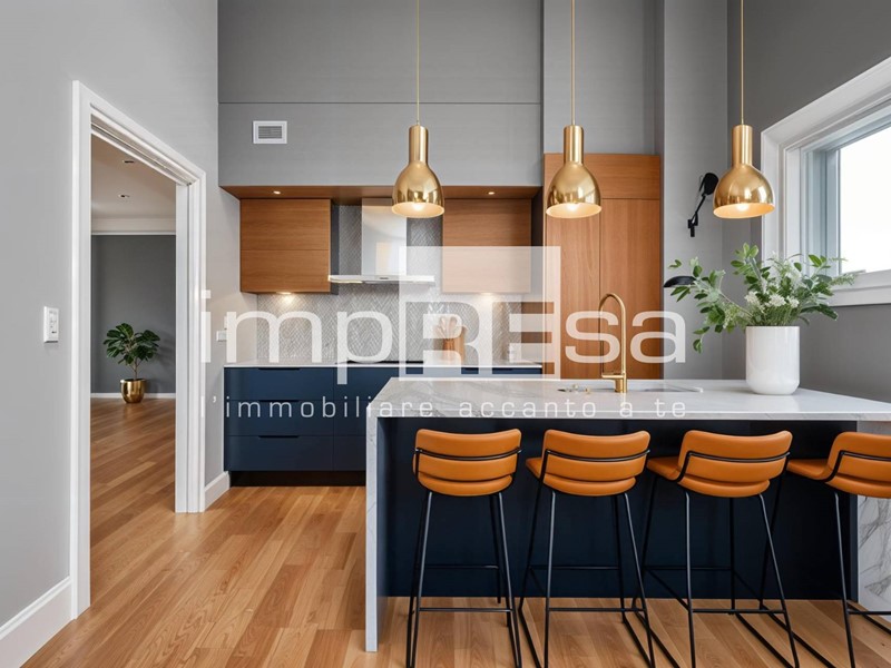 La cucina separata di 14 m², arricchita da una porta in cristallo satinato, unisce eleganza e funzionalità.