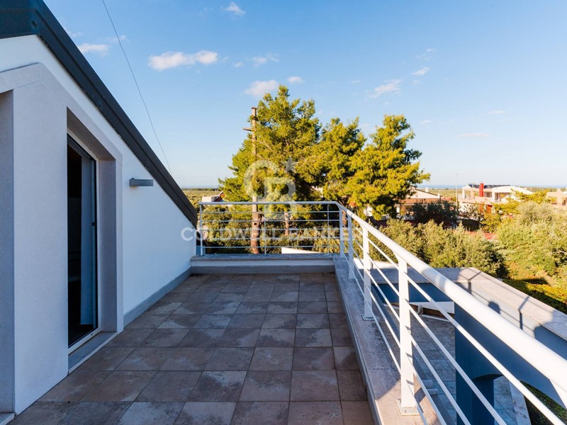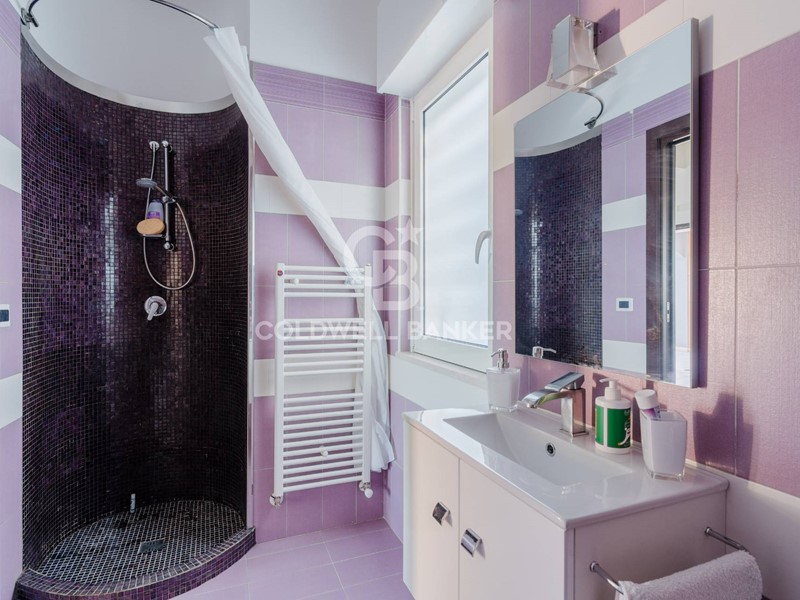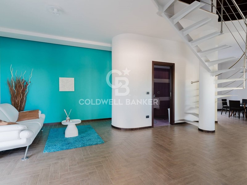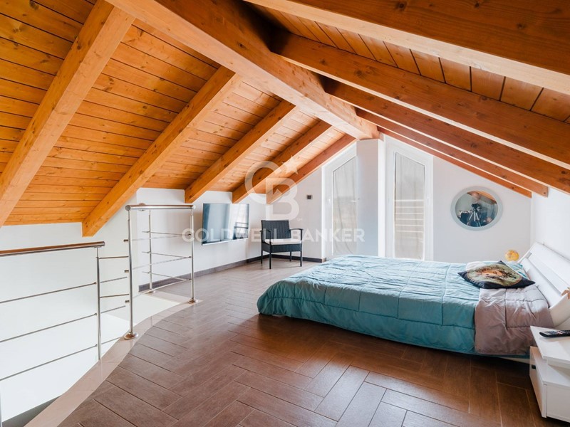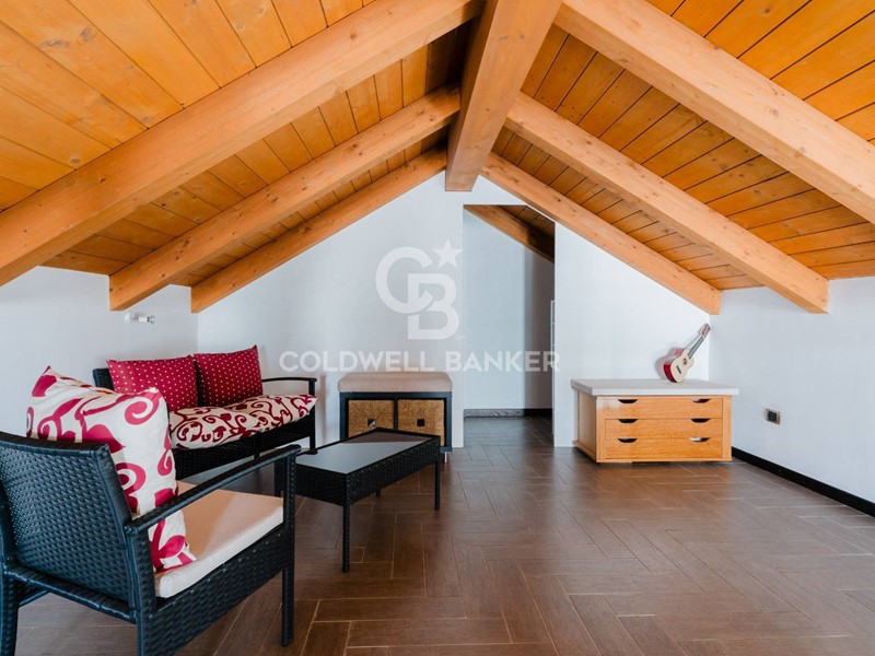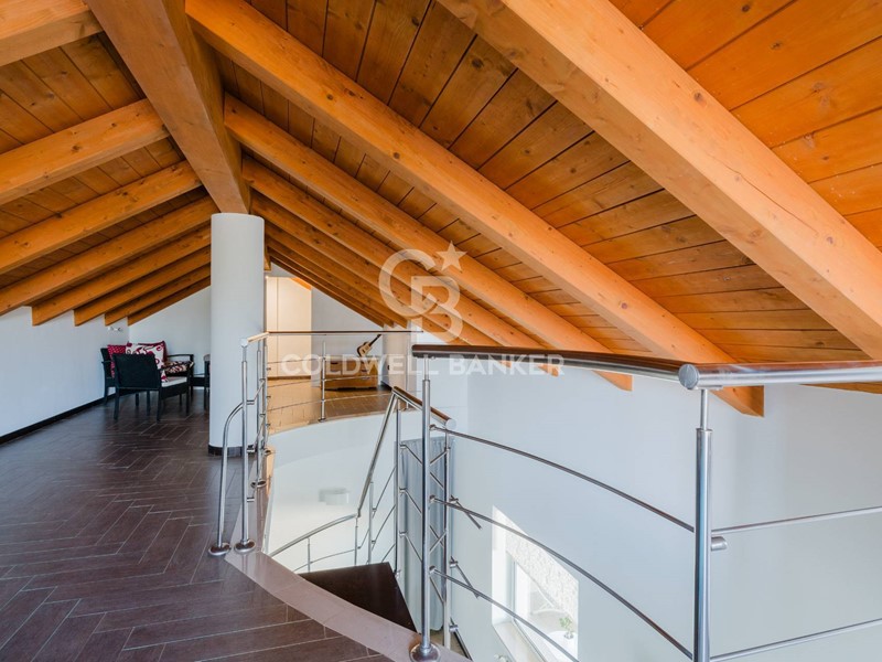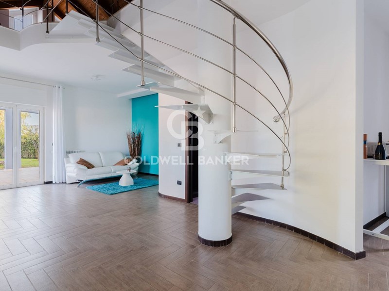 Il secondo corpo, al primo piano, si sviluppa in un accogliente living room, un bagno con elegante doccia a mosaico e una cucina abitabile. Una scala a chiocciola conduce al piano mansardato dove si trovano zona letto, cabina armadio e un terrazzo panoramico dal quale, nelle giornate limpide, è possibile intravedere il mare. Gli spazi esterni, ampi e fruibili, circondano la villa e consentono di vivere allaperto tra momenti di relax, cene con amici e gioco per i più piccoli. Completa il quadro un box auto doppio di generose dimensioni, raro e prezioso in zona.