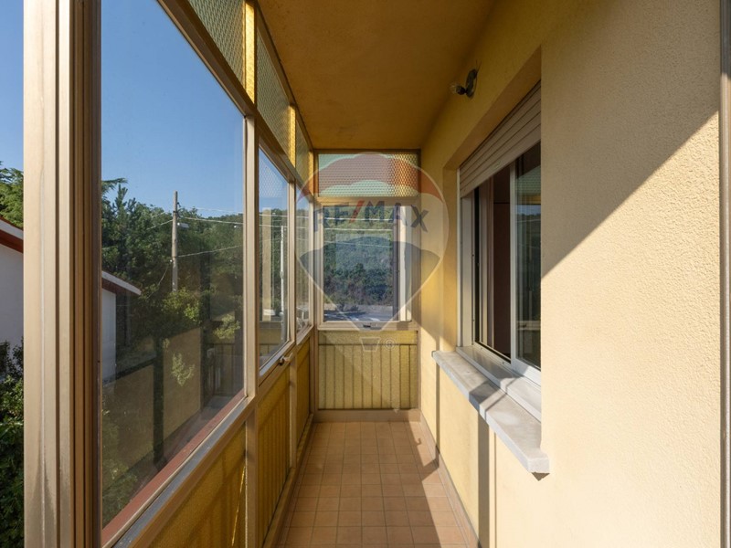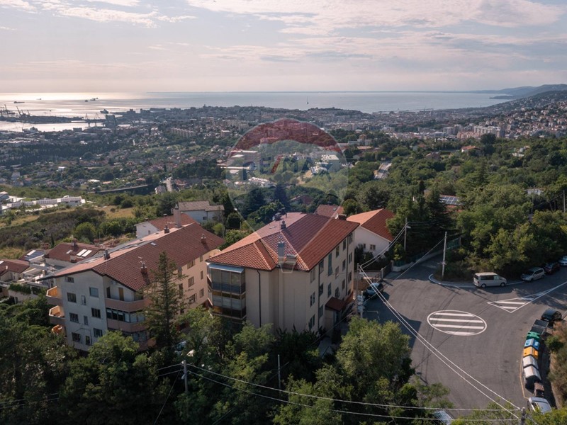 Internamente lappartamento, dotato di porta blindata, è composto da un corridoio di ingresso dal quale è possibile accedere alle due camere matrimoniali, al bagno completo e finestrato e alla zona giorno composta da cucina separata e da un salone con balcone ad angolo parzialmente verandato con spettacolare vista panoramica su tutto il Golfo di Trieste.