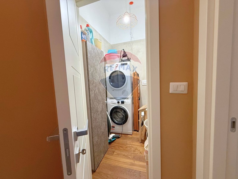 Completano la proprietà un bagno dal fascino retrò, rifinito con materiali di pregio e dotato di doccia walk-in, ed infine un pratico vano lavanderia.