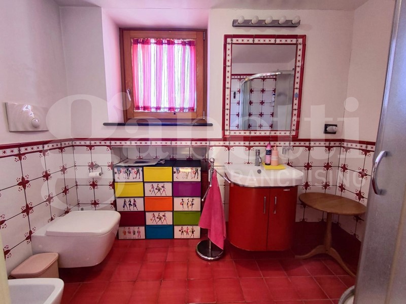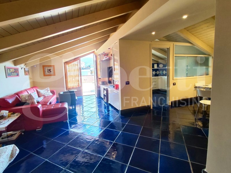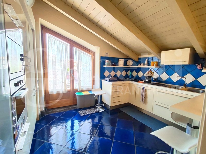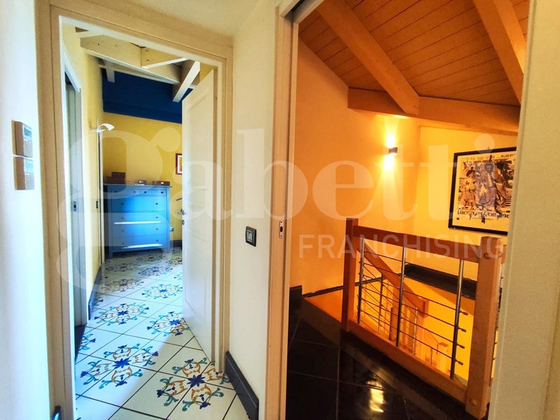 Una scala interna in legno, funzionale e di grande impatto estetico, conduce al piano superiore di circa 80 mq, dove si sviluppa una suggestiva mansarda con soffitti inclinati e spazi esterni panoramici.