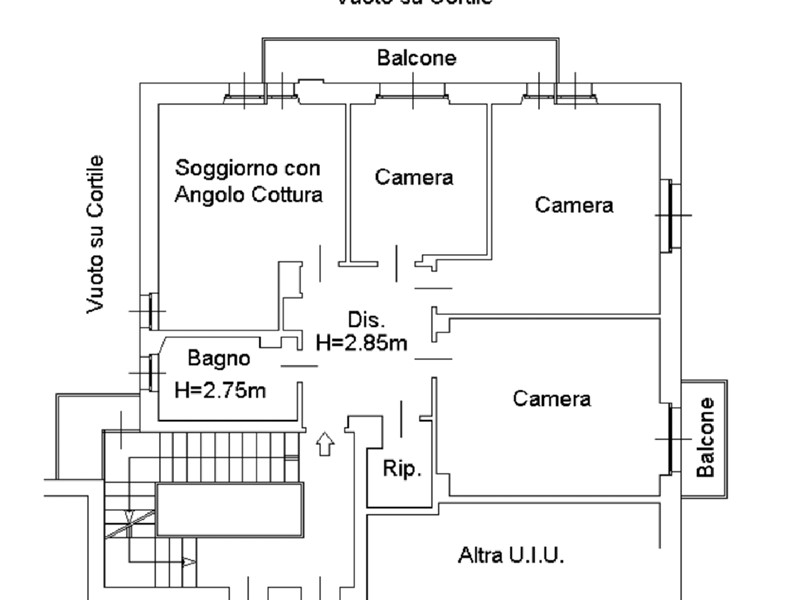 L'immobile è composto da: ingresso, due camere, soggiorno, ampia cucina abitabile, bagno, ripostiglio, due balconi e cantina.