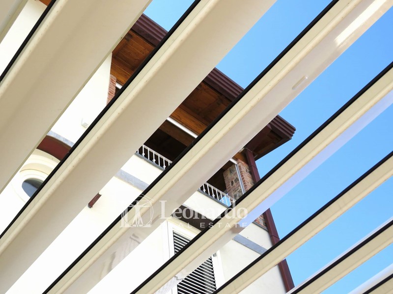 Al pian terreno si presentano l'ingresso, la sala, un servizio con doccia, uno studio e la cucina che, come la sala, si affaccia direttamente sul lato del giardino dove insiste la piscina.