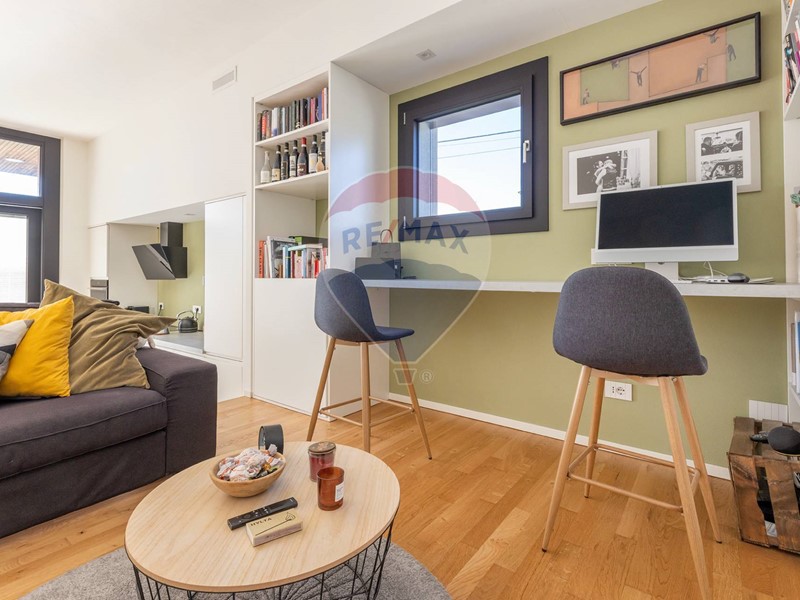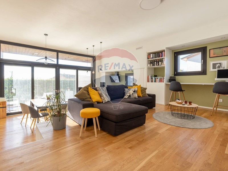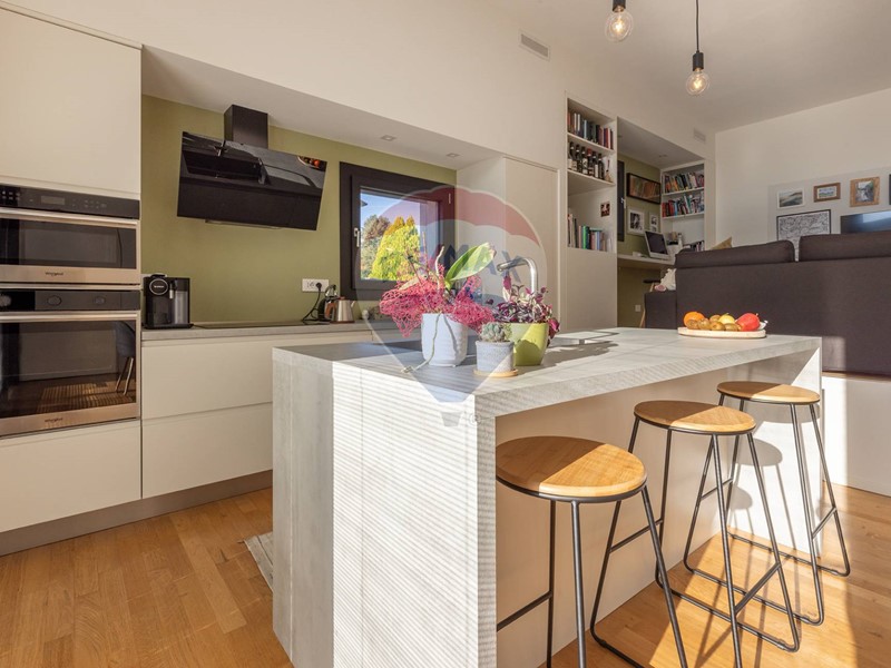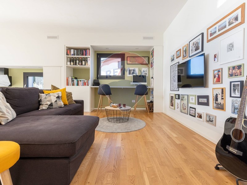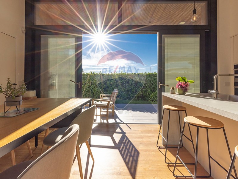 Lingresso si apre su un accogliente atrio che conduce alla zona giorno, composta da un elegante soggiorno con cucina a vista e affacci diretti sul giardino.