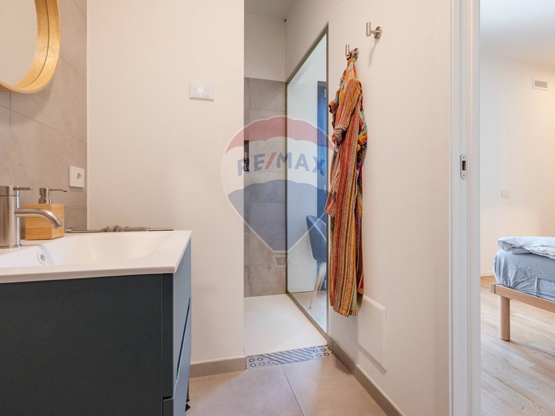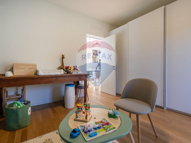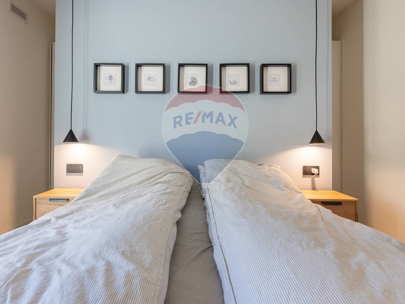 La zona notte ospita due ampie camere da letto, di cui una con cabina armadio, e due bagni finestrati dal design contemporaneo.