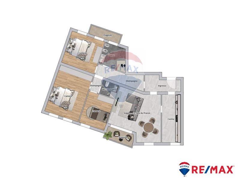Si compone di ingresso, soggiorno, angolo cottura (eventualmente divisibile dal soggiorno) e un poggiolo, nella zona giorno. Nella zona notte, tre comode camere matrimoniali, di cui una con ampia cabina armadio, due bagni, un poggiolo, rendono l'appartamento ben disposto e spazioso, atto ad essere abitato anche da una famiglia numerosa.