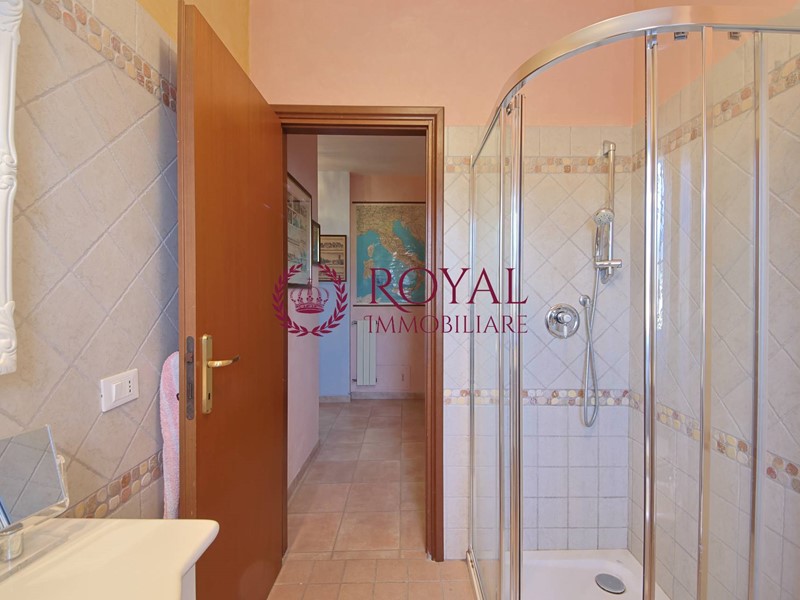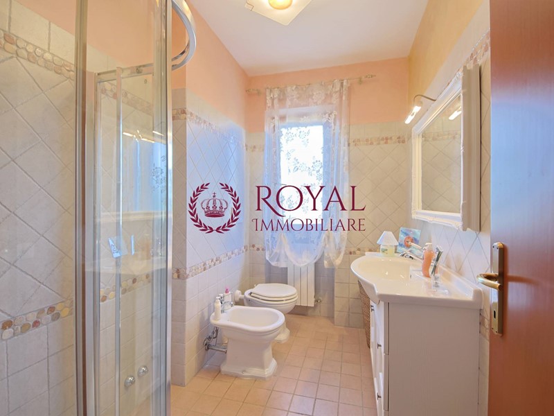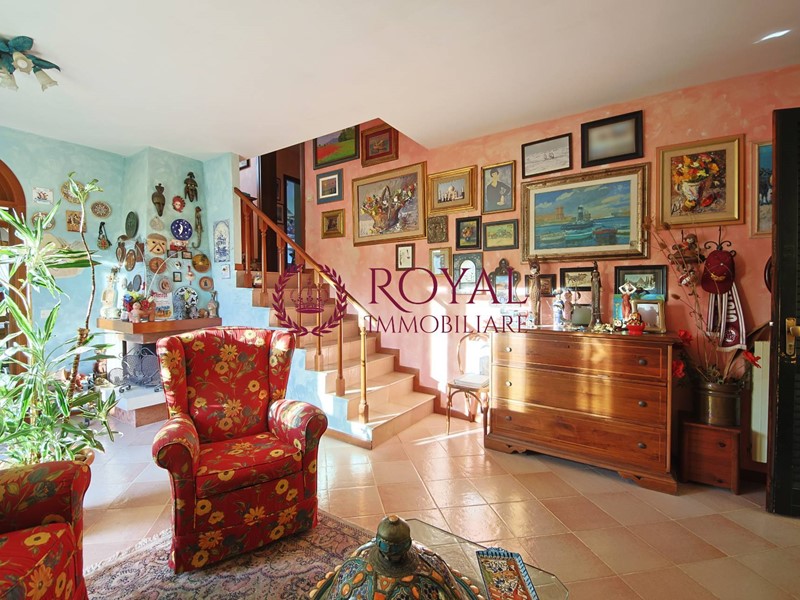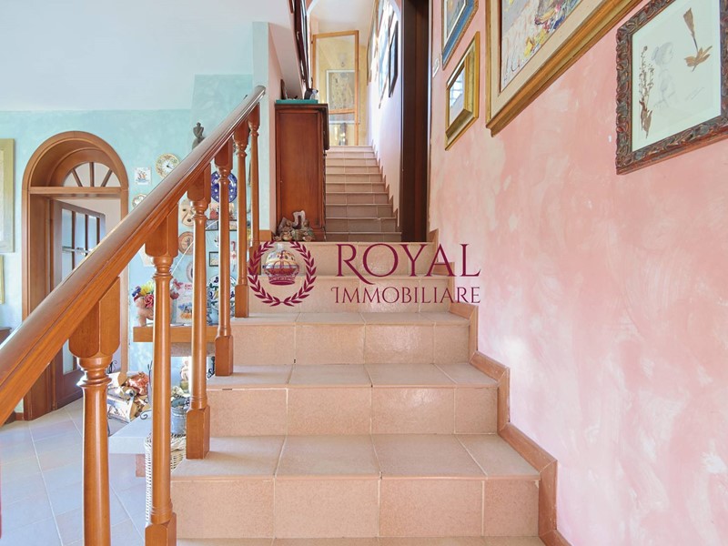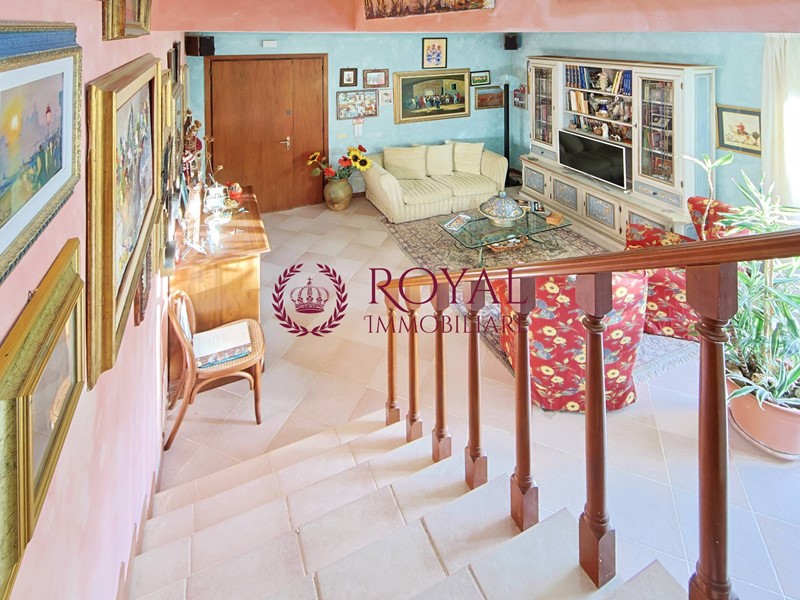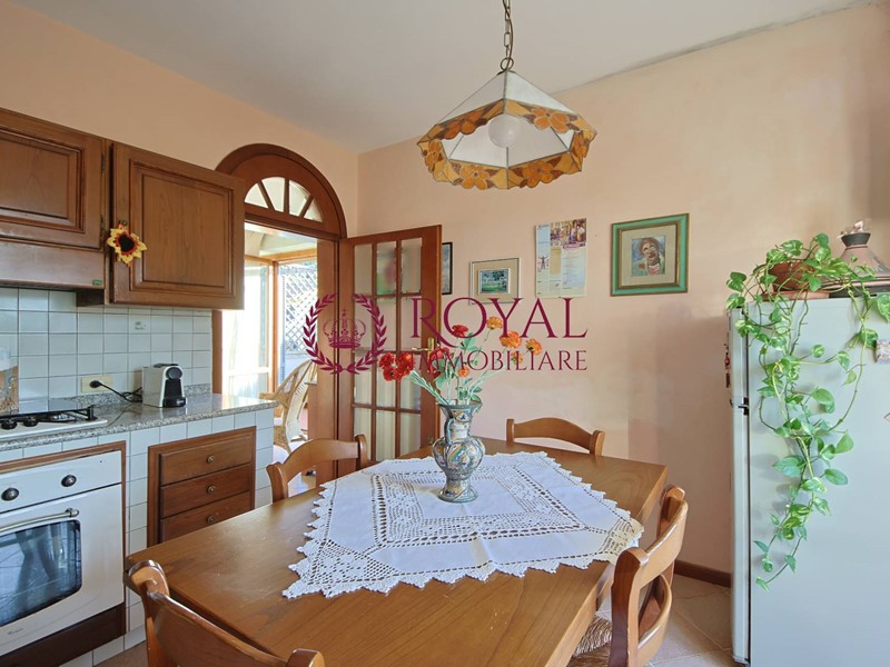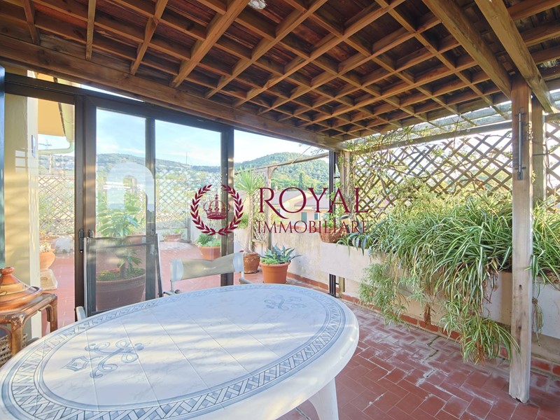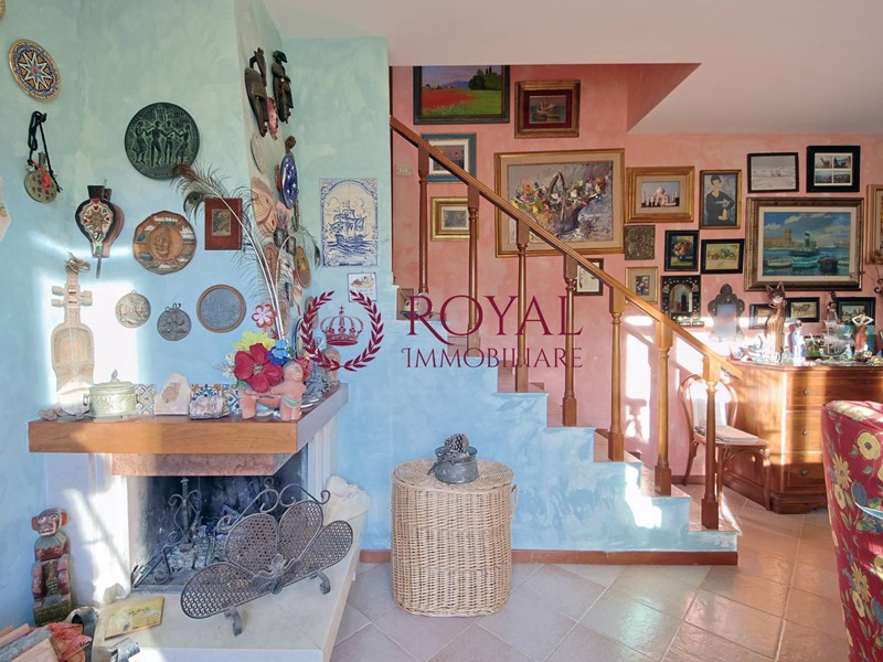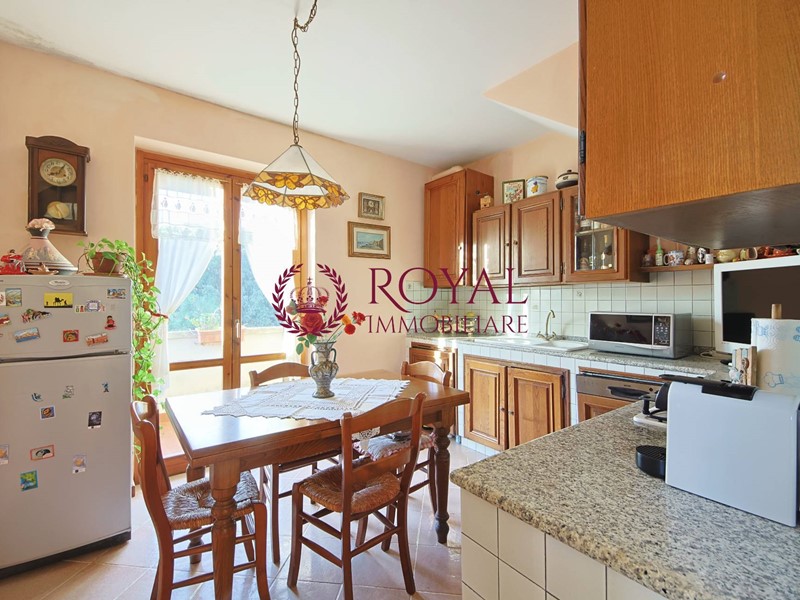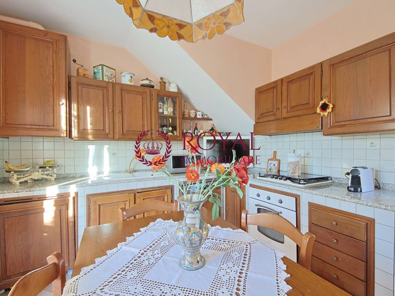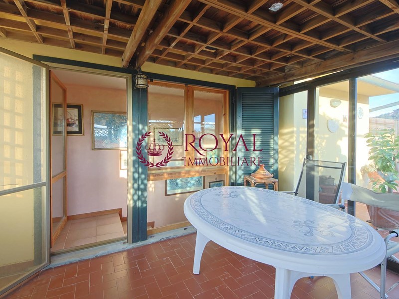 La cucina è separata e completamente attrezzata, con accesso diretto a un delizioso patio esterno, perfetto per gustare i pasti all'aperto nelle giornate più calde, comoda scale per accedere al piano notte dove troviamo tre camere da letto, altro terrazzo, due bagni. Scala per andare al terrazzo superiore di circa 50 metri quadrati con vista mare, ripostiglio, ottima esposizione. Termo autonomo. Completa la proprietà un garage. Posto auto coperto. Cantina.
