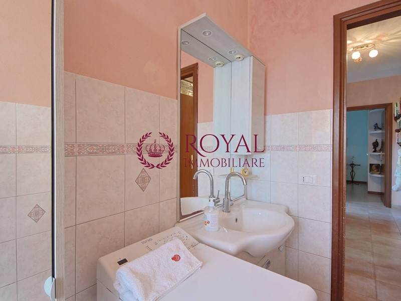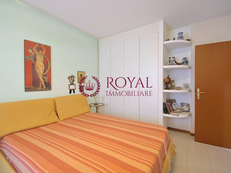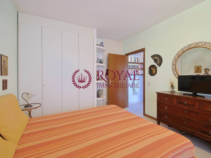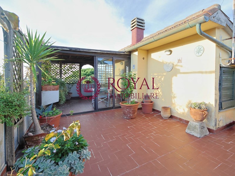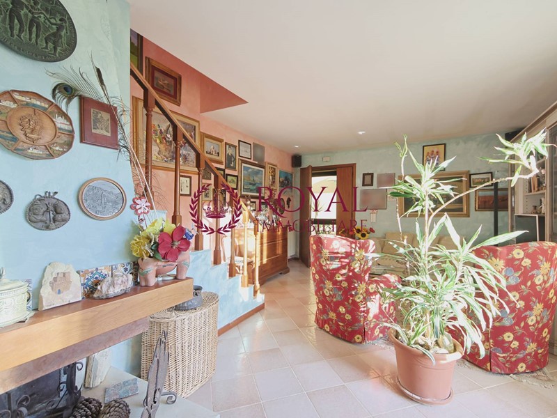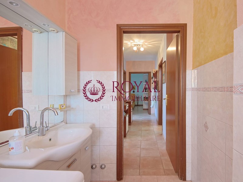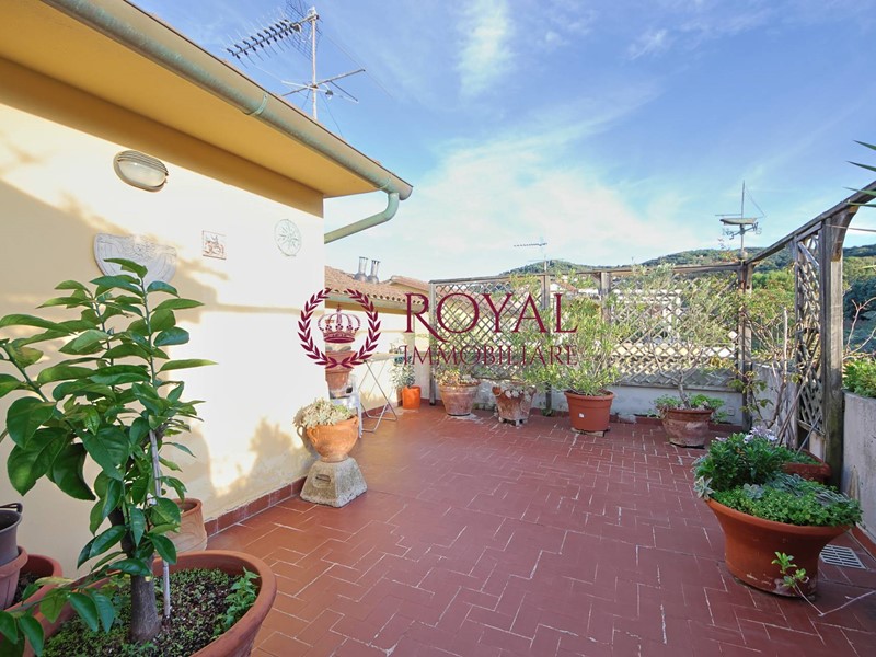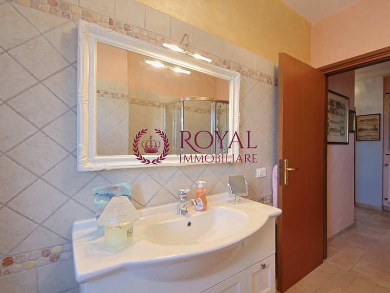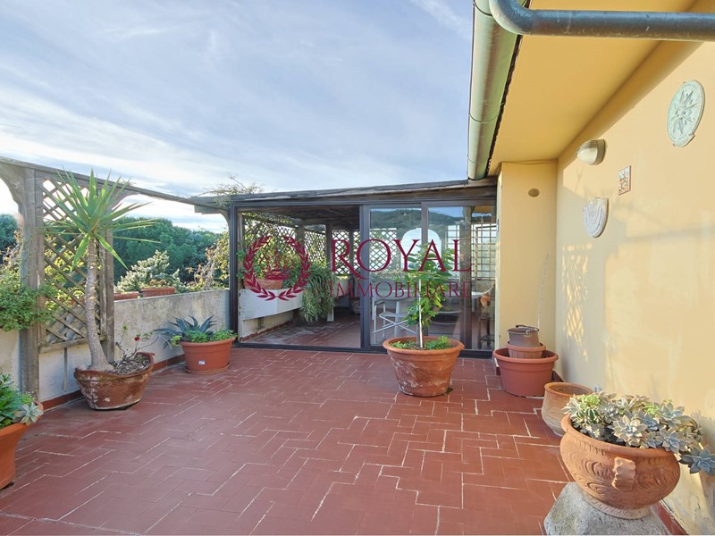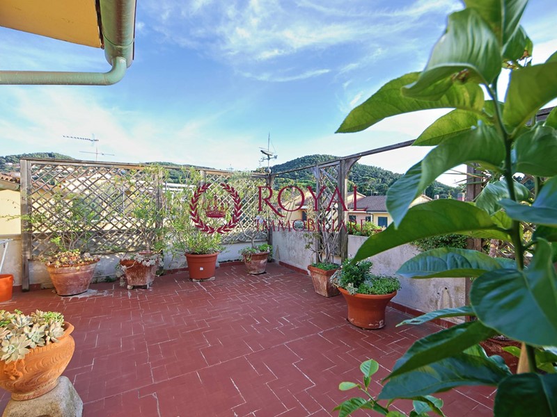 La cucina è separata e completamente attrezzata, con accesso diretto a un delizioso patio esterno, perfetto per gustare i pasti all'aperto nelle giornate più calde, comoda scale per accedere al piano notte dove troviamo tre camere da letto, altro terrazzo, due bagni. Scala per andare al terrazzo superiore di circa 50 metri quadrati con vista mare, ripostiglio, ottima esposizione. Termo autonomo. Completa la proprietà un garage. Posto auto coperto. Cantina.