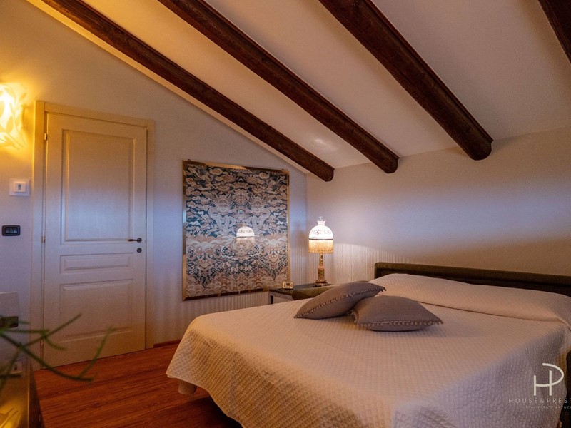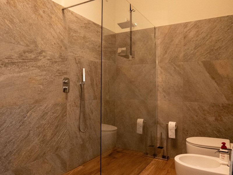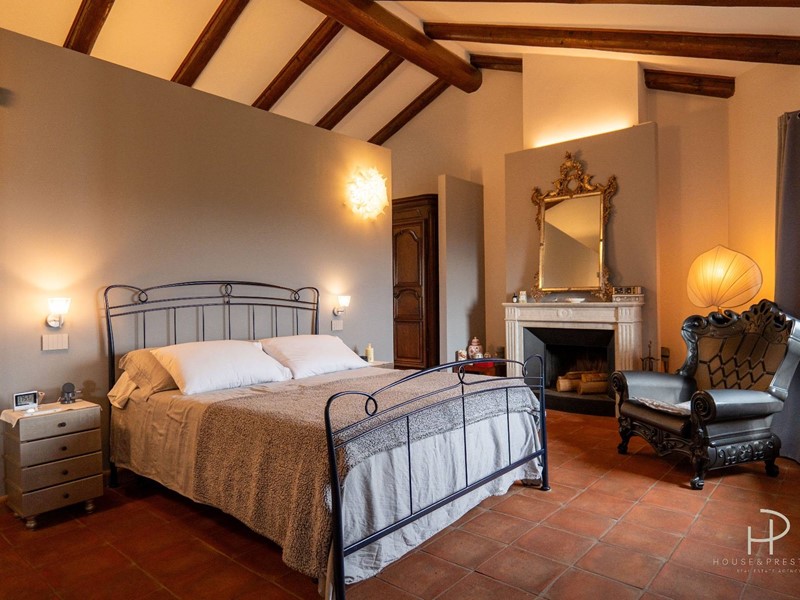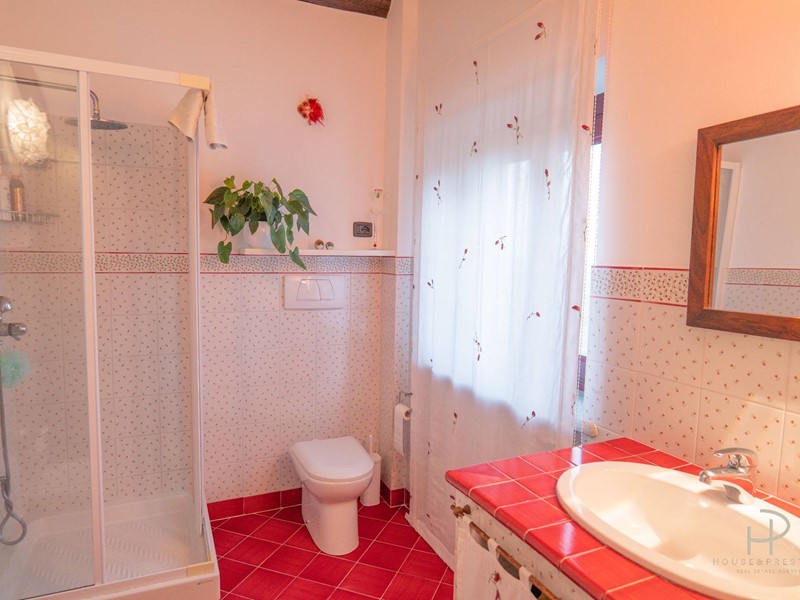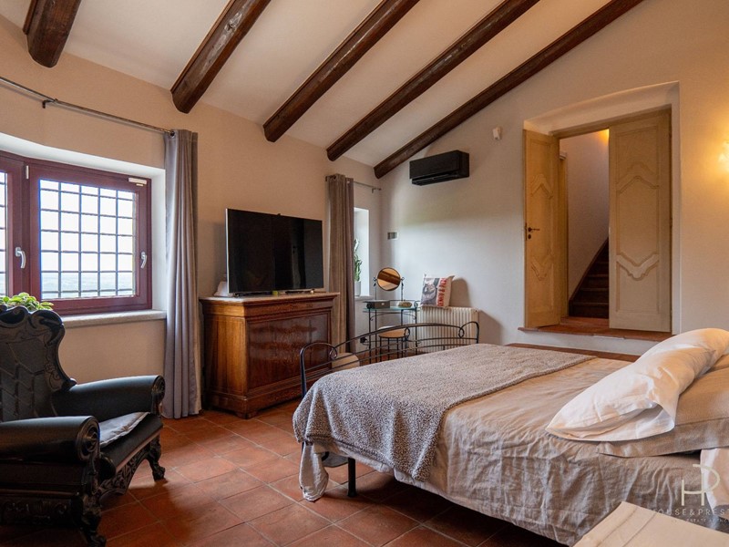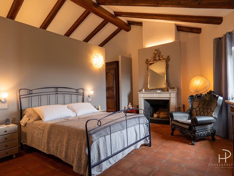 La zona notte al piano terra comprende una camera matrimoniale con travi a vista e cabina armadi, impreziosita da pavimenti in cotto fiorentino. Il bagno principale è stato completamente ristrutturato di recente, con materiali e finiture di pregio.