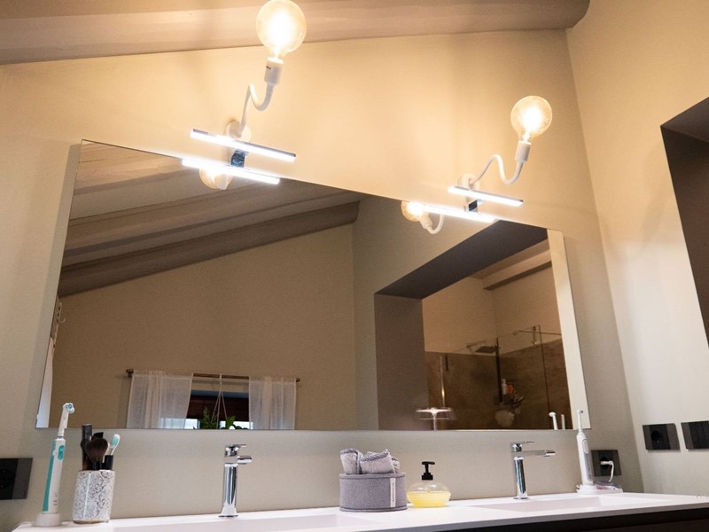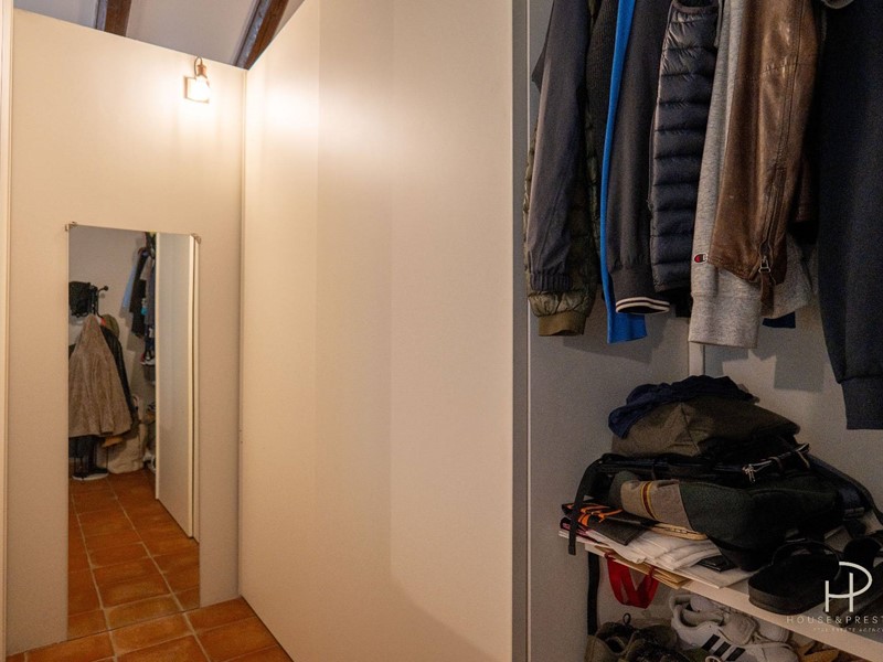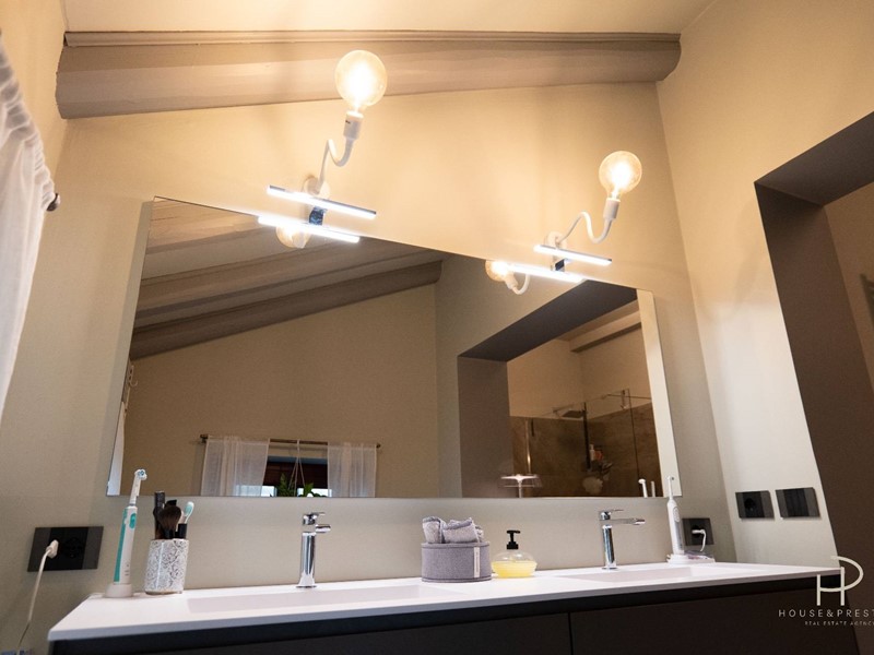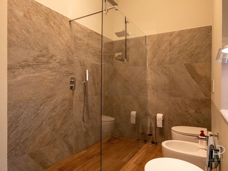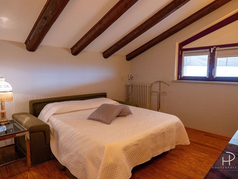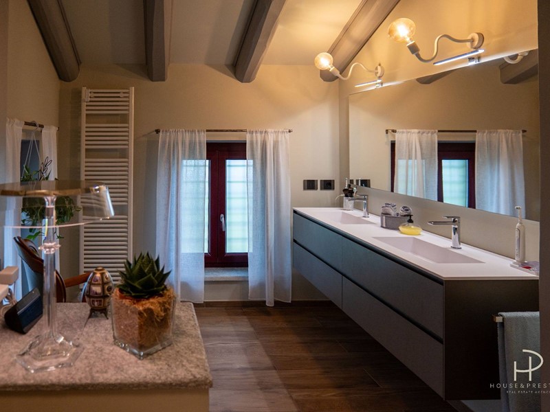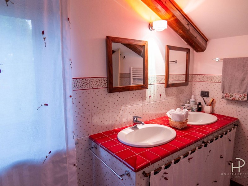 La zona notte al piano terra comprende una camera matrimoniale con travi a vista e cabina armadi, impreziosita da pavimenti in cotto fiorentino. Il bagno principale è stato completamente ristrutturato di recente, con materiali e finiture di pregio.