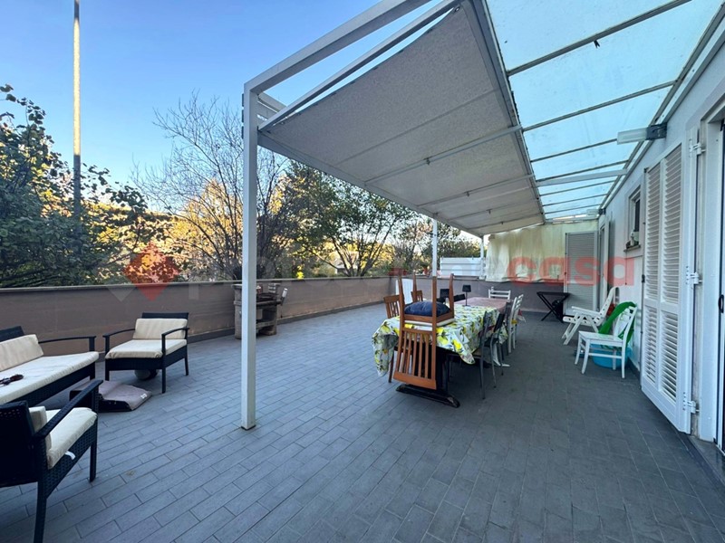 La splendida terrazza abitabile, dotata di tenda da sole, rappresenta un autentico prolungamento della casa, perfetta per vivere e ricevere all'aperto durante la bella stagione.