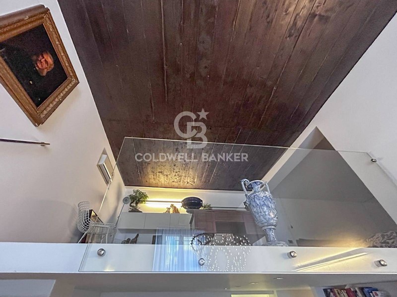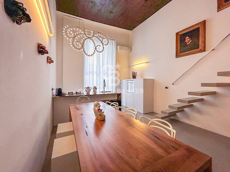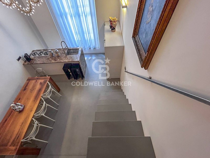 Lingresso conduce a un ampio open space con cucina a vista e zona living accogliente, con un arredo scelto con gusto ed equilibrio. Una scala moderna e lineare conduce al soppalco mansardato, dove trova spazio una confortevole e luminosa zona notte, perfettamente integrata con larchitettura dellambiente.