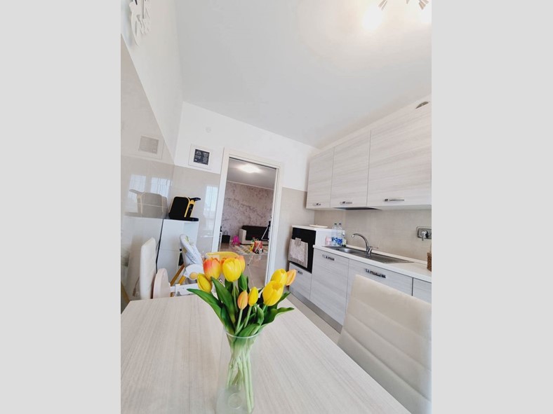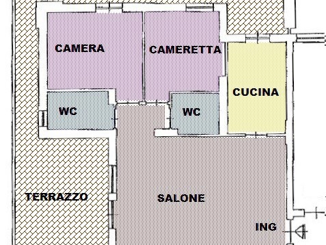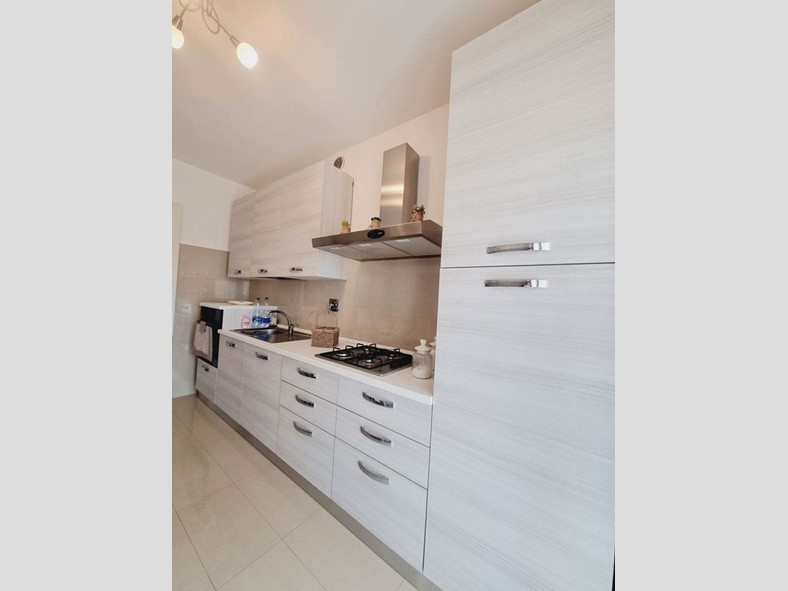 Composizione interna: ingresso su ampio salone a vista, luminoso e accogliente, con accesso diretto a un terrazzo vivibile, cucina abitabile, separata e funzionale, con accesso a un balcone comunicante con il terrazzo.