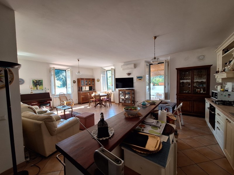Salendo al primo piano si apre un ampio soggiorno luminoso, con cucina a vista, perfetto per vivere la casa in modo conviviale e moderno. Qui ogni ambiente respira grazie alla luce naturale e all’accesso diretto al grande terrazzo attrezzato, uno spazio davvero vivibile dove cenare all’aperto, rilassarsi o ospitare amici nelle belle giornate.