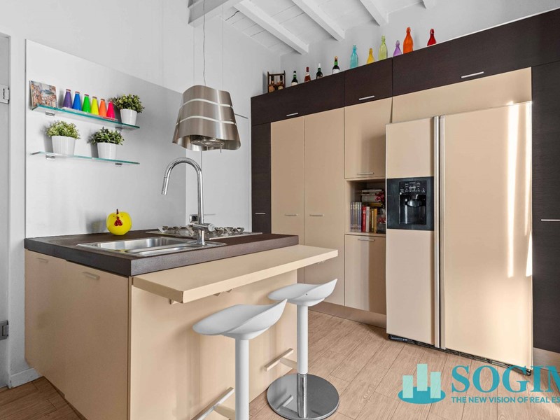 Accanto al living, troviamo la cucina abitabile, completa di bagno di servizio e locale lavanderia.