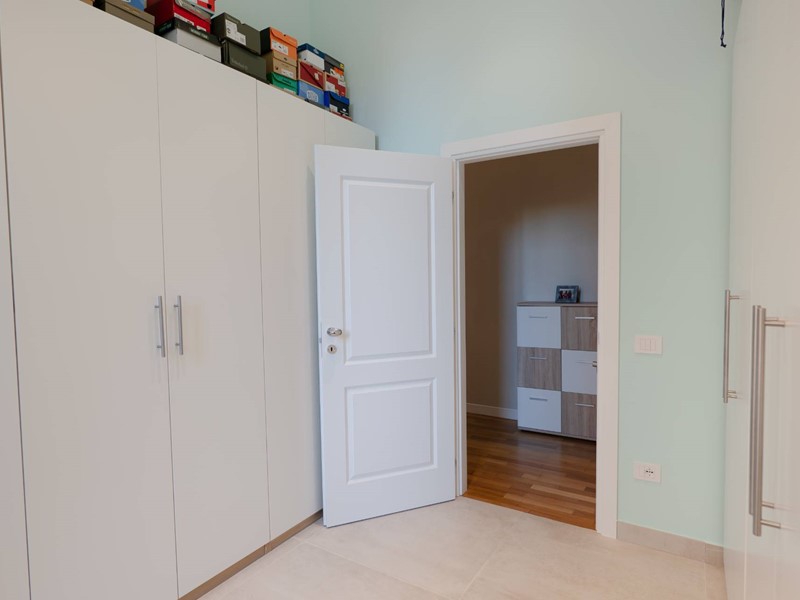 Lappartamento, al piano rialzato, si apre su un accogliente disimpegno che conduce alla zona notte, composta da una camera matrimoniale, una seconda camera con bagno privato e cabina armadio e un bagno padronale con vasca. Il salone molto ampio e luminoso è collegato tramite porta scorrevole alla cucina abitabile, creando un ambiente perfetto per vivere e intrattenere. Dal salone si accede al balcone, mentre dalla cucina si può raggiungere un meraviglioso terrazzo di circa 40 m², ideale per pranzi allaperto, feste e momenti di relax.