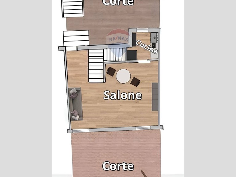 L'immobile é sviluppato su due livelli ed é situato al piano terra catastale ma l'accesso é in cima alle scale d'ingresso. Prima di entrare, sulla sinistra troviamo una prima corte di proprietà esclusiva dove sarà possibile passare dei piacevoli momenti di convivialità all'esterno. Entrando dalla porta di ingresso troviamo la zona giorno composta dallo spazioso salone dal quale si può accede ad una seconda corte di proprietà esclusiva, ed il cucinotto. Al piano superiore troviamo una luminosa zona notte composta da ampia camera matrimoniale, una cameretta ed un bagno finestrato con vasca.