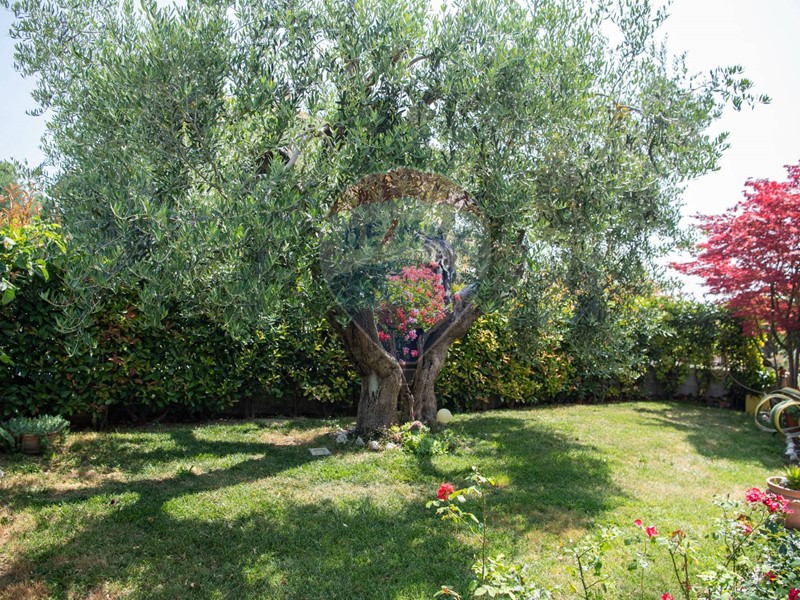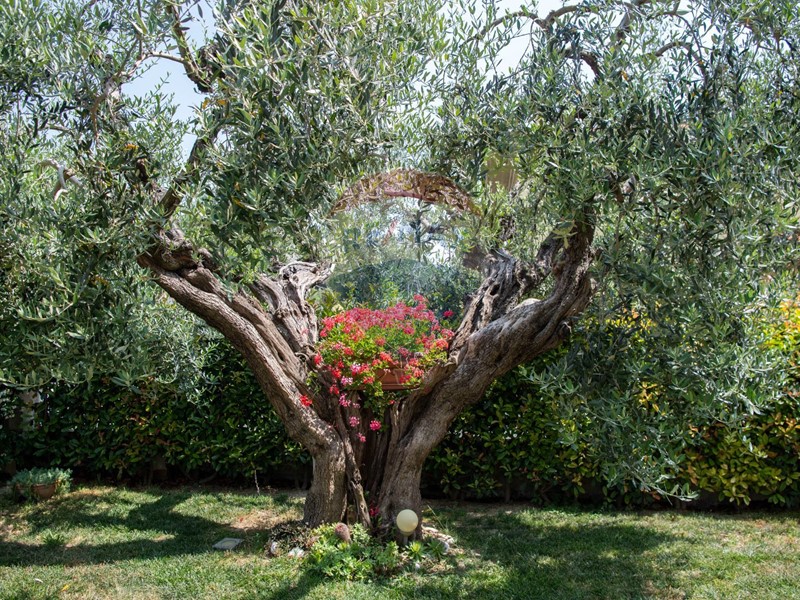 L'ingresso che conduce all'appartamento è valorizzato da un giardino esclusivo che circonda la proprietà su tre lati, donando un tocco di natura con piante ornamentali, due ulivi e spazi pavimentati.