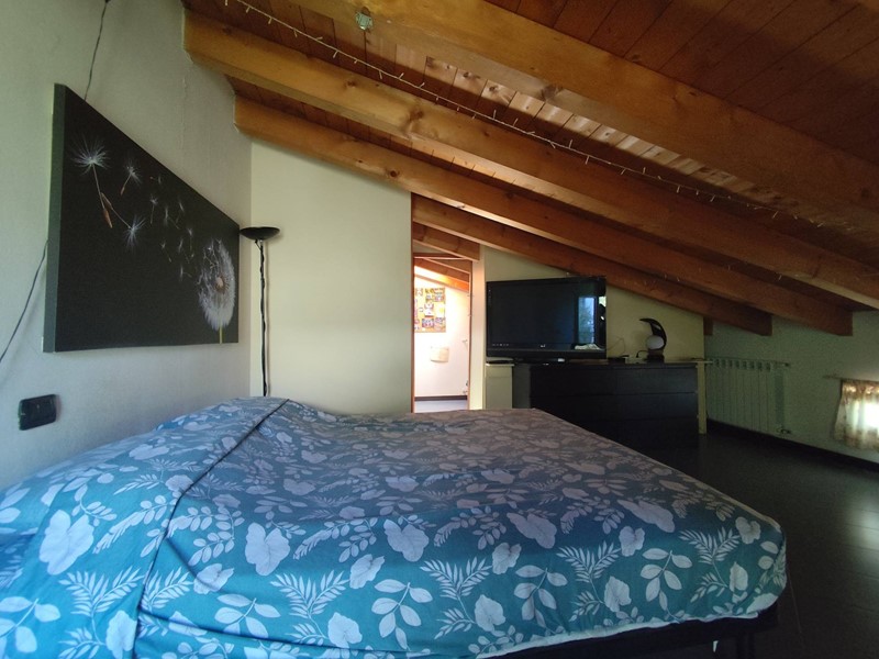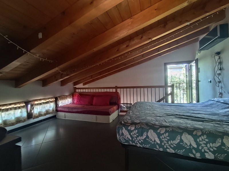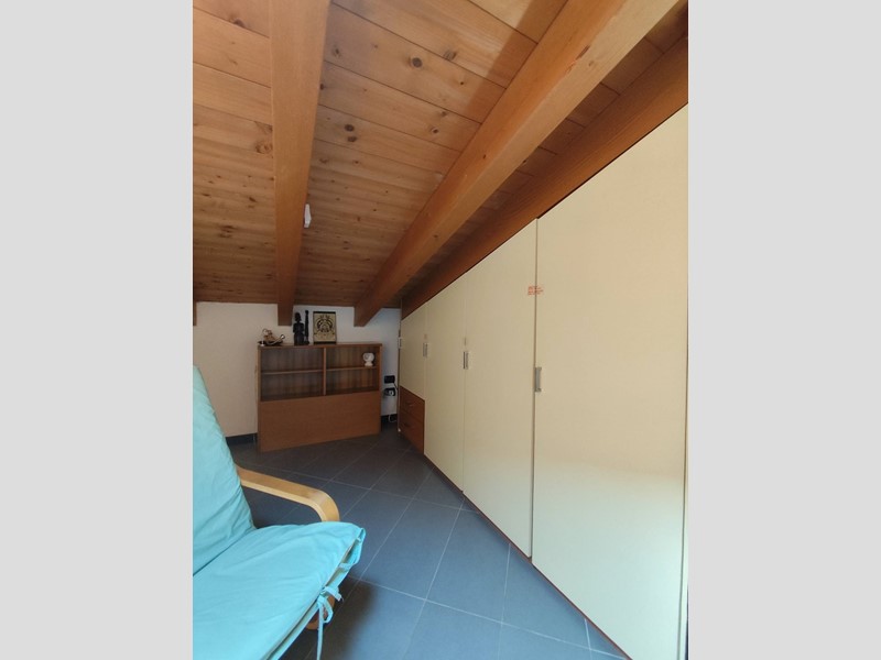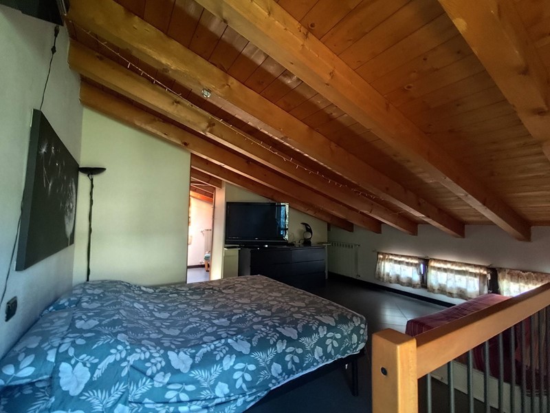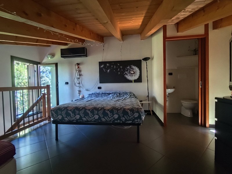 Dal soggiorno, tramite elegante scala a vista in legno, si accede al piano superiore dove si trovano un camera matrimoniale mansardata, una stanza armadi con studio uno studio e un bagno di solo servizio.