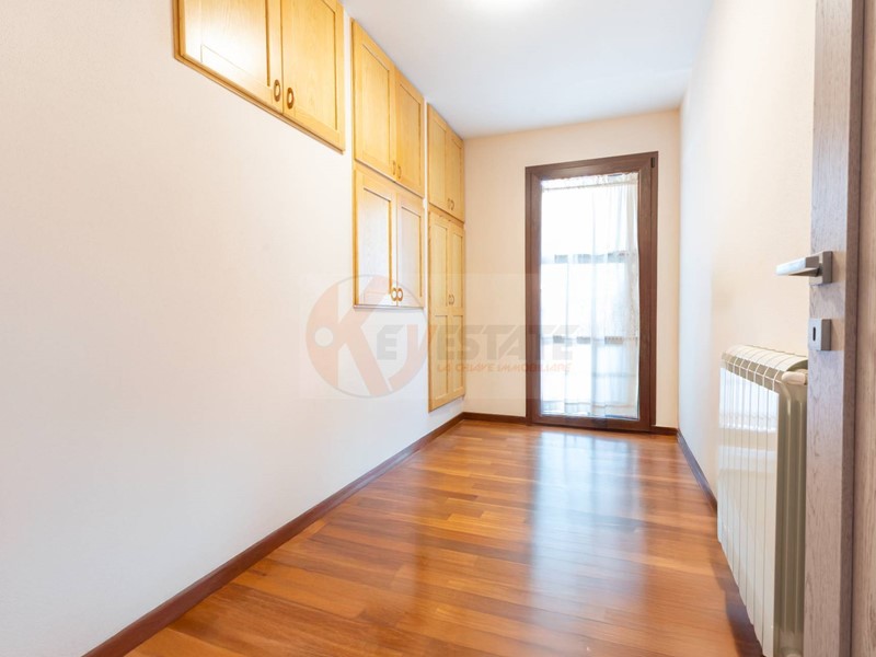 Un disimpegno conduce al primo bagno e a un comodo ripostiglio oggi adibito a zona lavanderia. Il piano terra comunica direttamente al box auto.