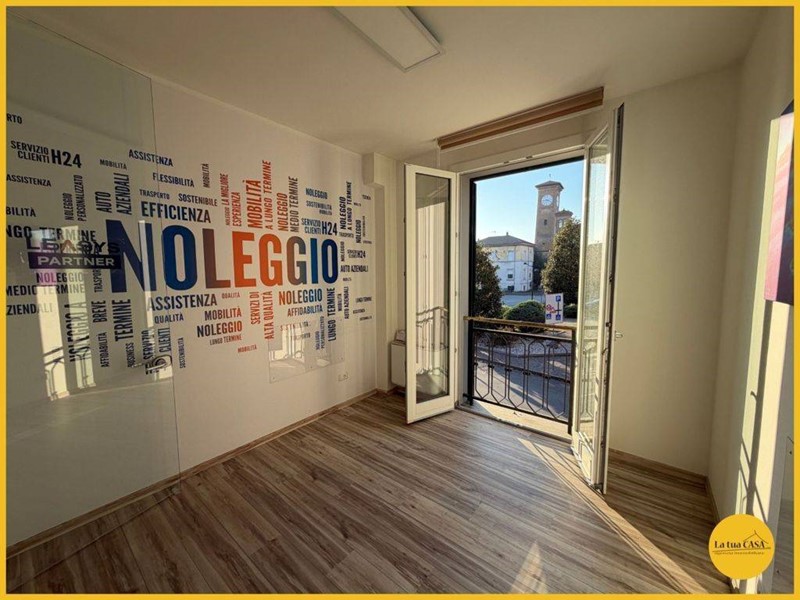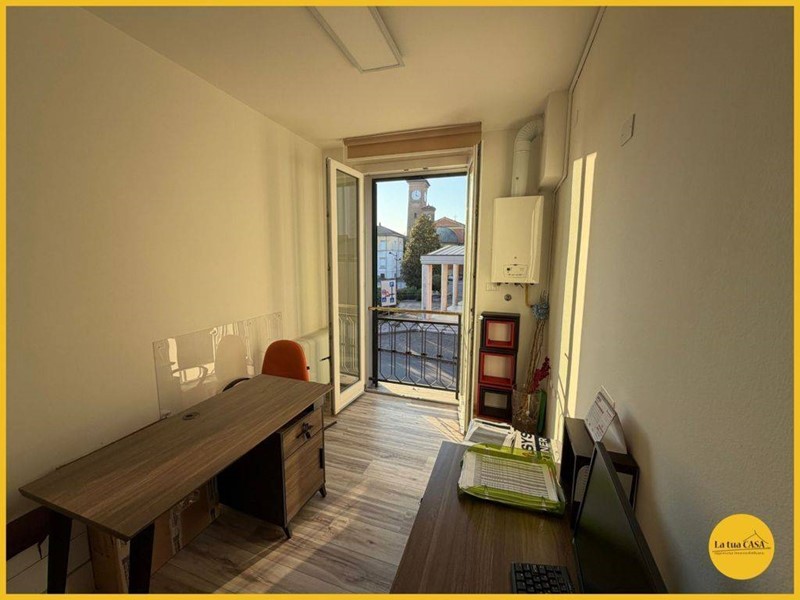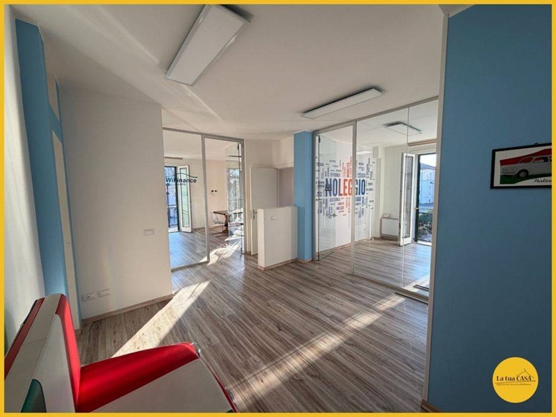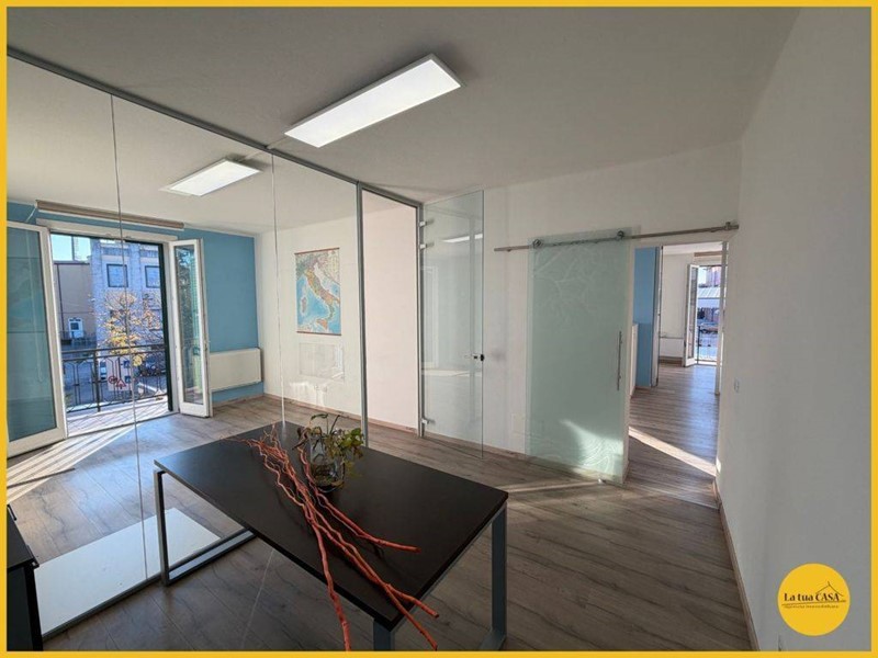 Ingresso, sala d'attesa, ampia zona riunioni, bagno con box doccia e quattro uffici. Al piano terra cantina